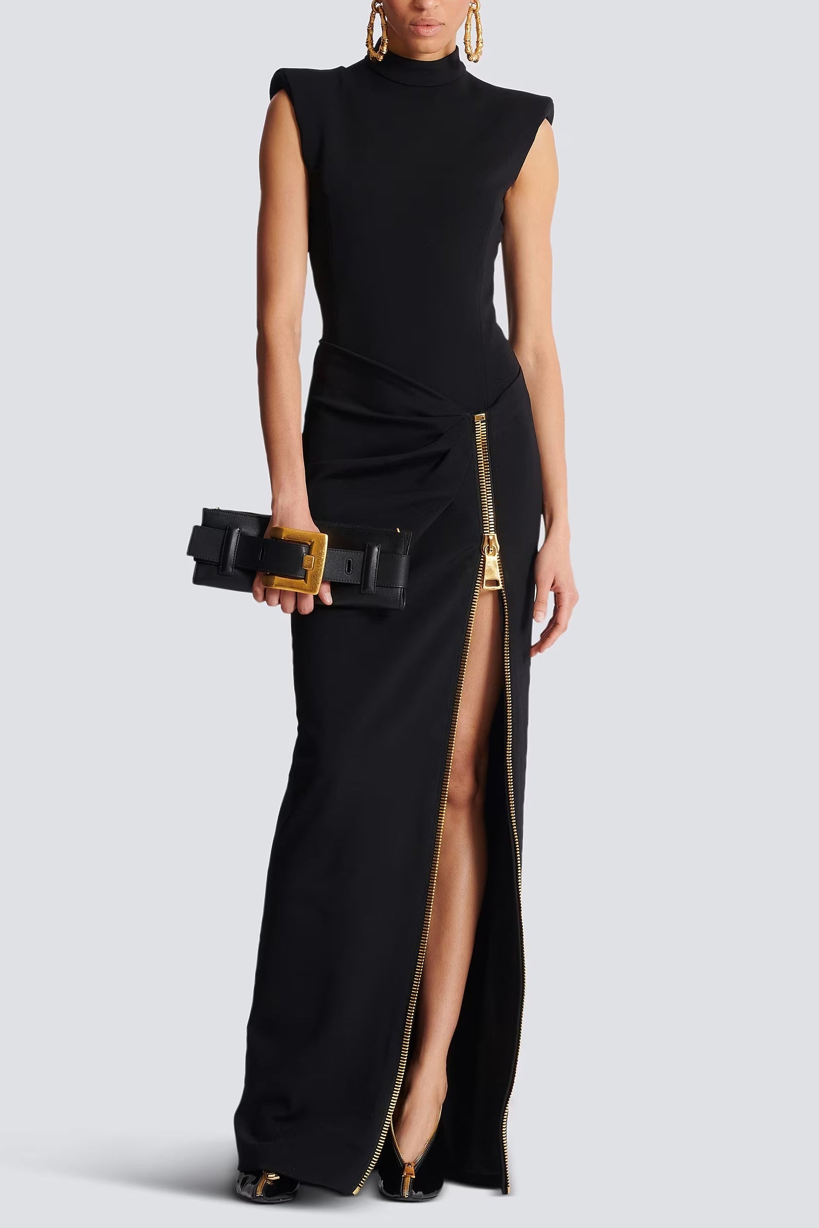Effortlessly elegant, this black sleeveless maxi dress combines modern sophistication with comfortable versatility. The fitted elastic jersey hugs your curves while the high slit adds a touch of allure and freedom of movement. A sleek front zipper makes dressing quick and easy, while the floor-length silhouette creates a polished, refined look perfect for evening events, date nights, or upscale casual occasions. You'll feel confident and supported in this timeless piece that transitions beautifully from season to season.