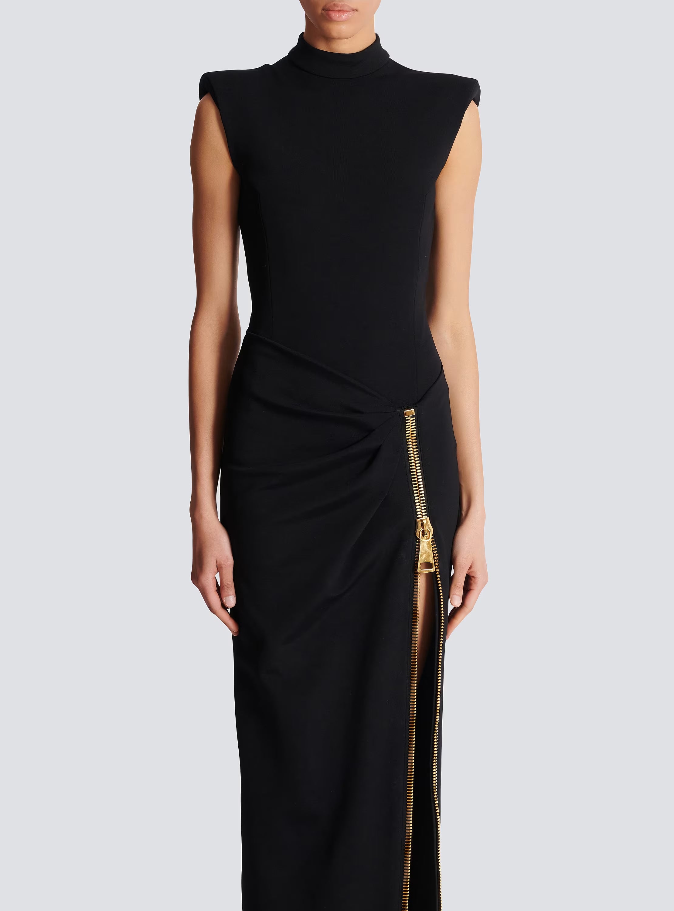 black Sleeveless Zipper high Slit Elastic jersey maxi Dress