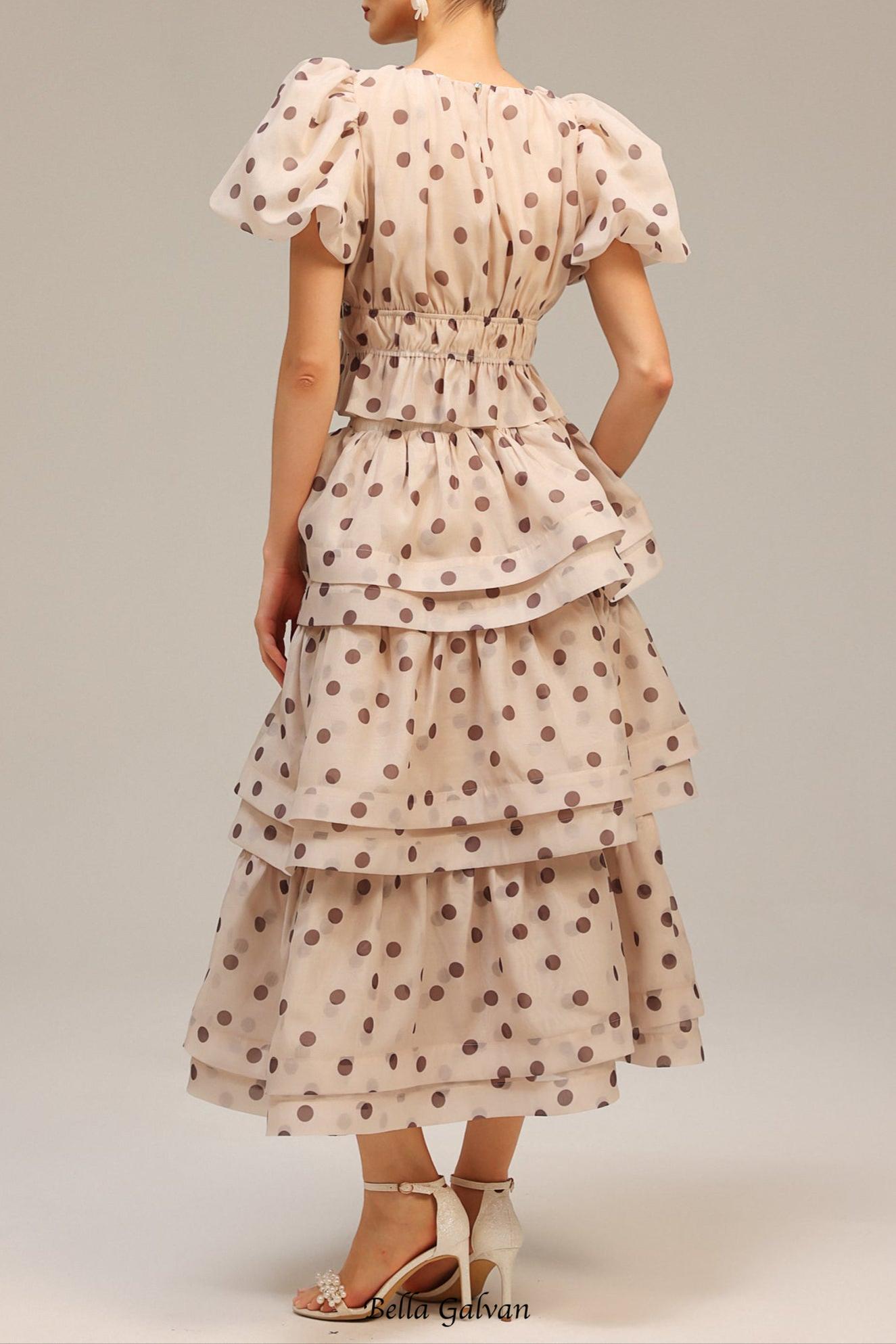 damla beige Puff Sleeves Dot Printed Top And Skirt Two-Piece Set