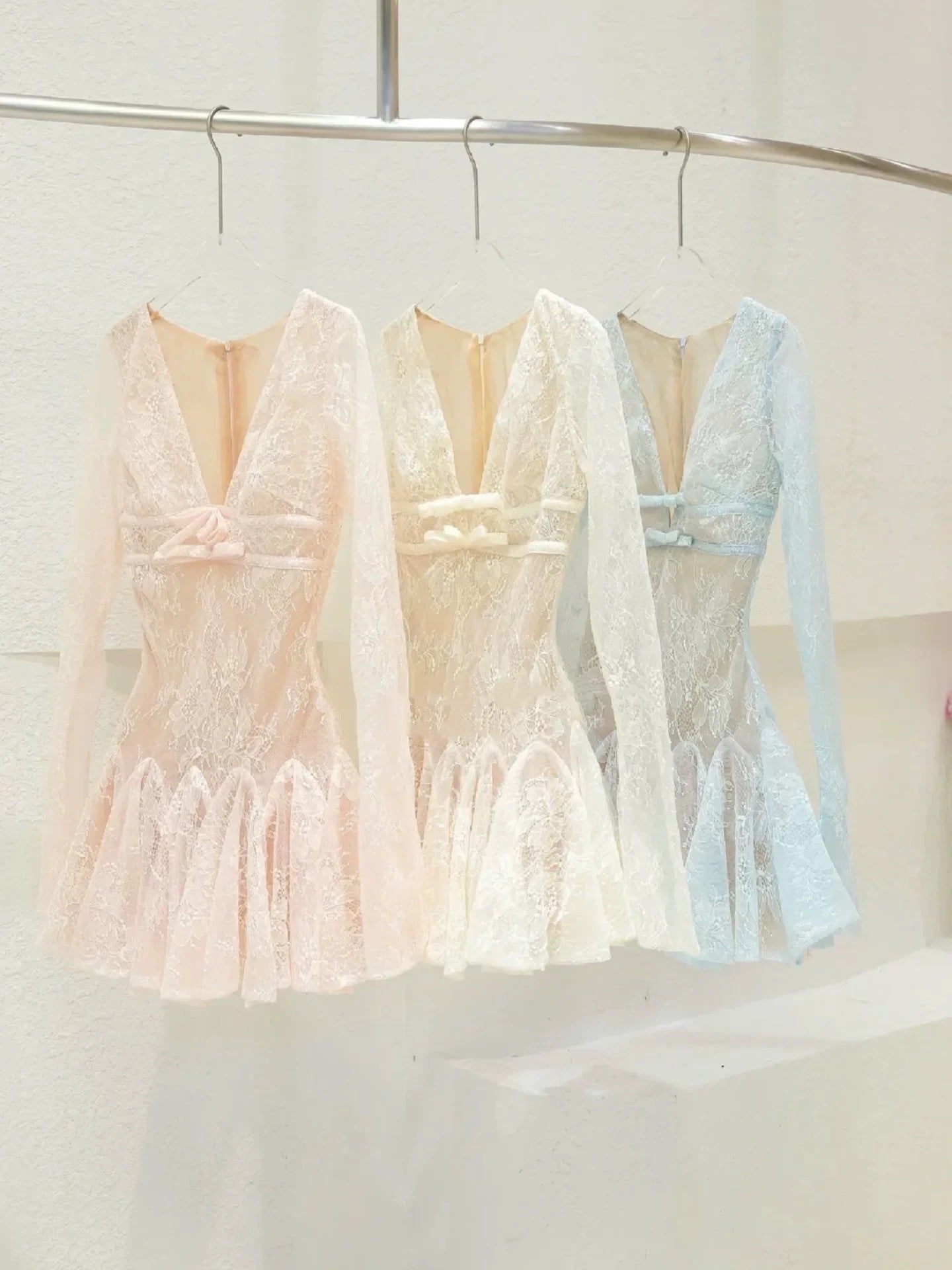 eileen Long-sleeve v-neck lace A-line mini dress in pink