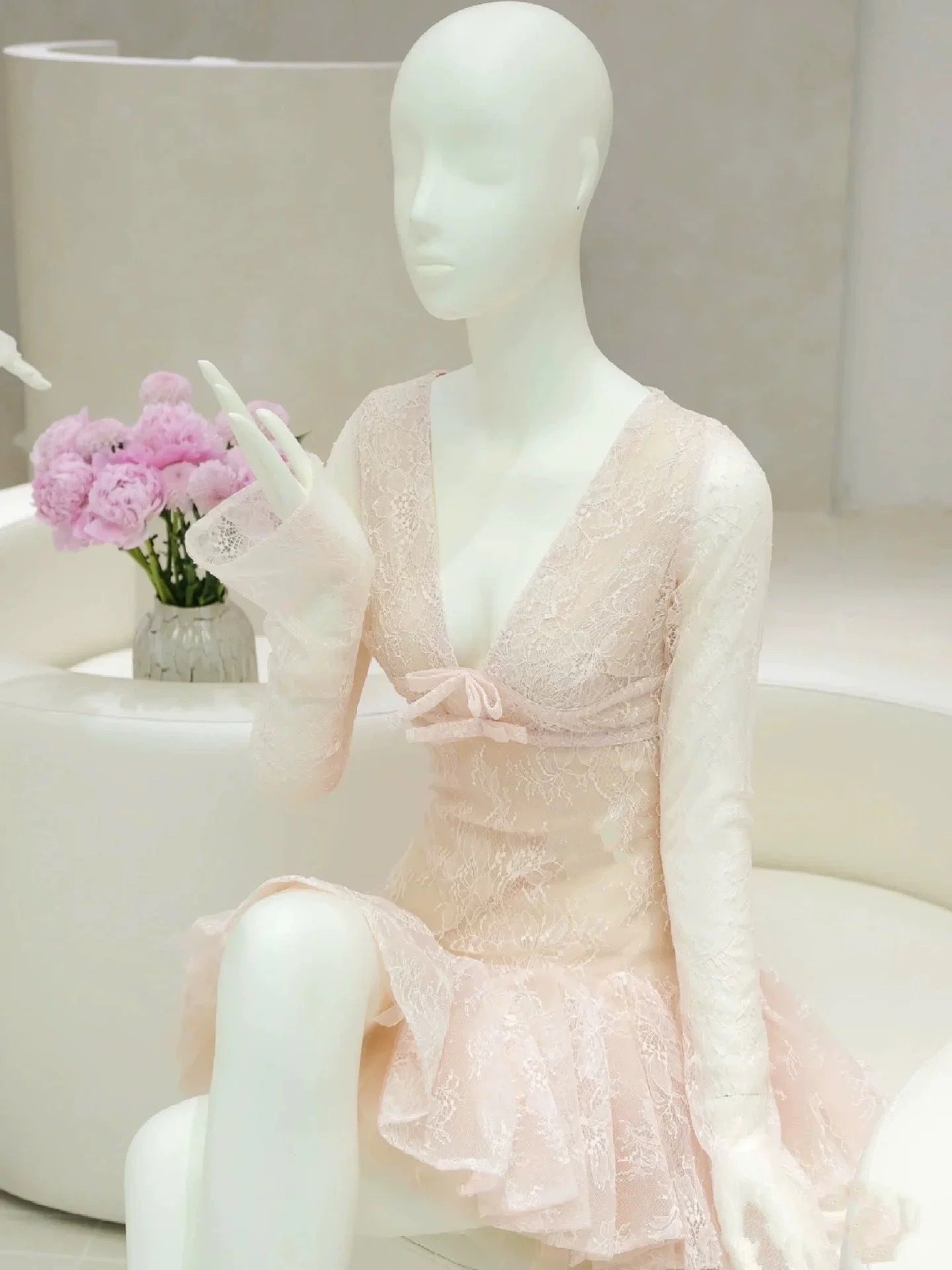 The Eileen dress features a delicate pink lace fabric with long sleeves and a flattering v-neckline. Its A-line cut creates a graceful silhouette that complements various body types, while the mini length adds a youthful, modern touch. Ideal for formal occasions or elegant daytime events, this dress blends sophistication with a soft, feminine appeal.