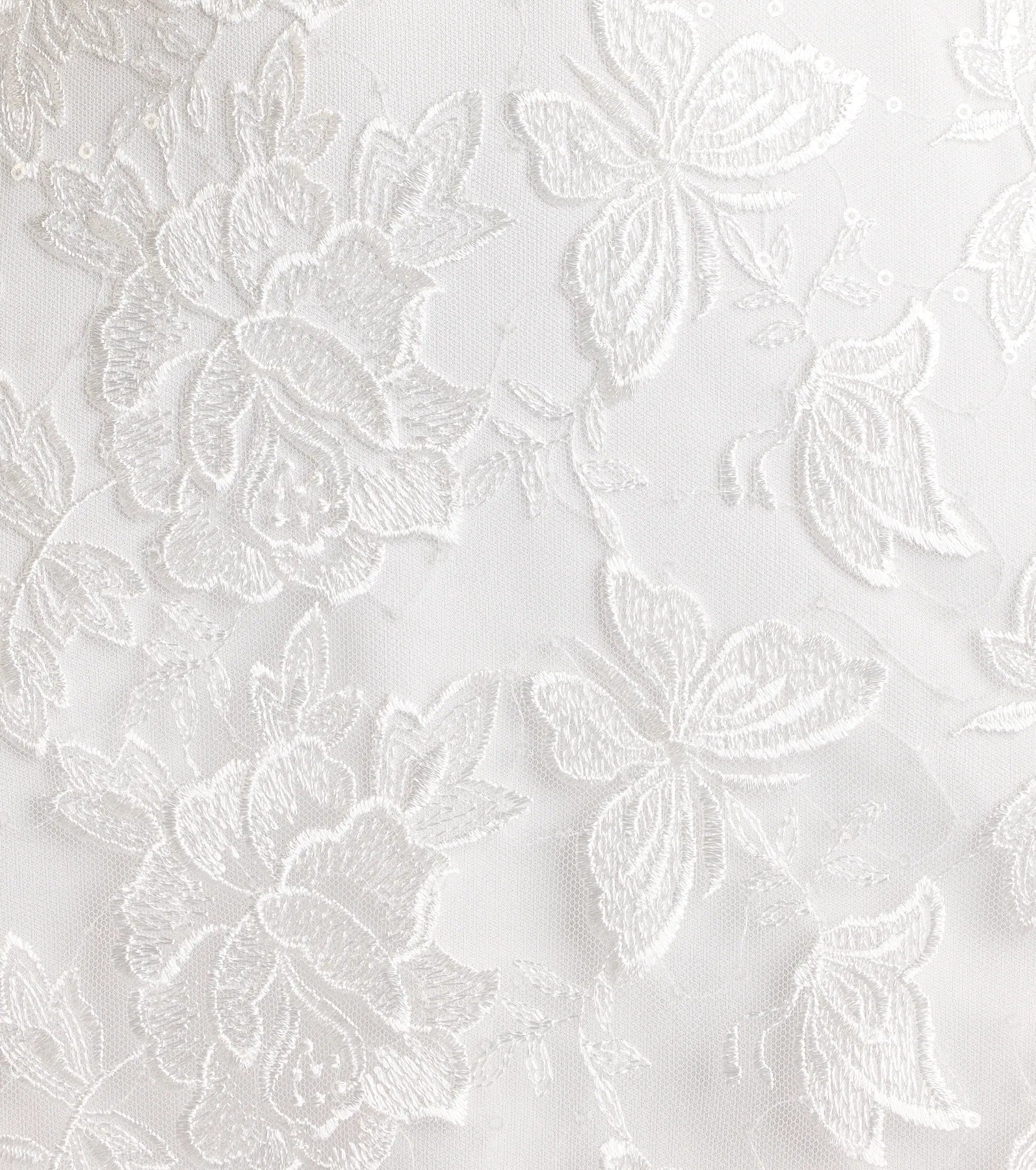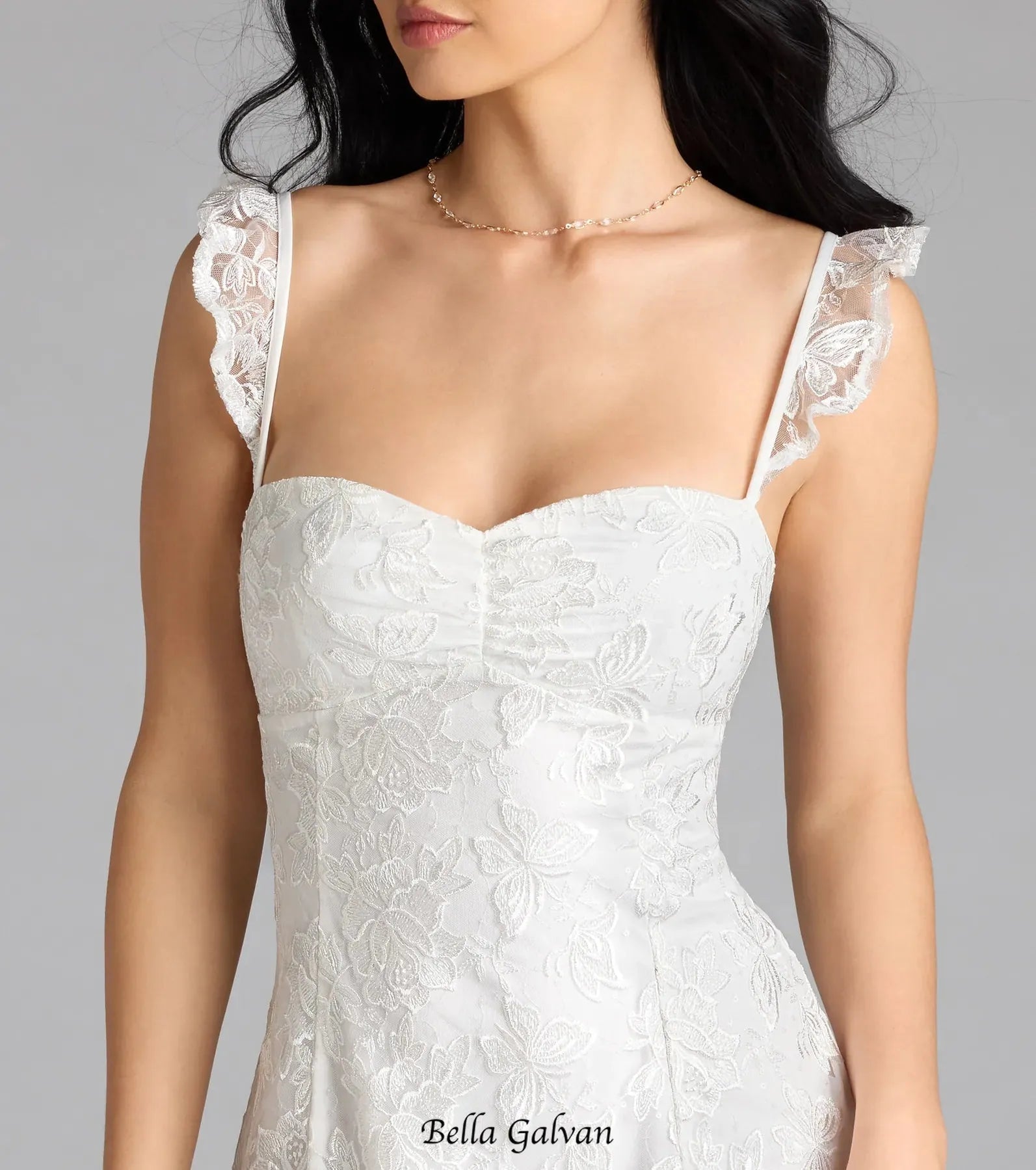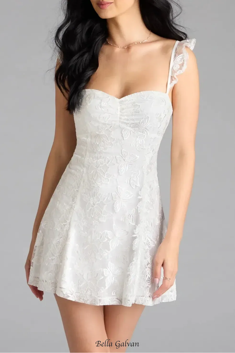 Impress in a flared skater dress with a gorgeous embroidered butterfly lace design throughout, a lace-up back design for a customized fit, ruffled straps, and a classic sweetheart neckline. Complete look with a sleek rhinestone clutch.