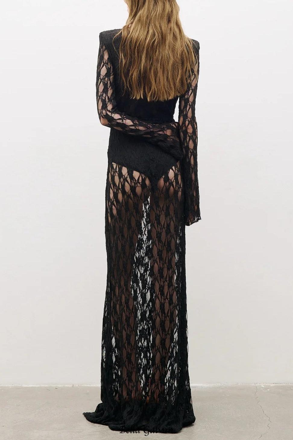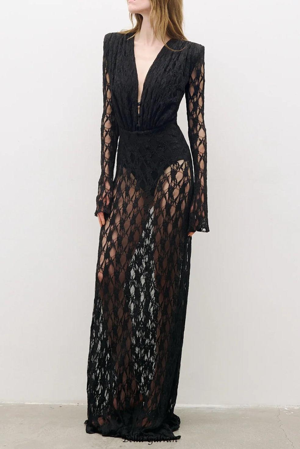 Embrace timeless elegance with the Gwendolyn V-Neck Maxi Dress. This stunning piece features delicate lace detailing throughout, a flattering V-neckline, and flowing long sleeves that create a sophisticated silhouette. The hollow lace design adds an ethereal touch while maintaining graceful coverage. Perfect for evening events, special occasions, or whenever you want to feel confident and beautiful. The classic black hue pairs effortlessly with any accessory, making this dress a versatile addition to your wardrobe that you'll treasure for years to come.