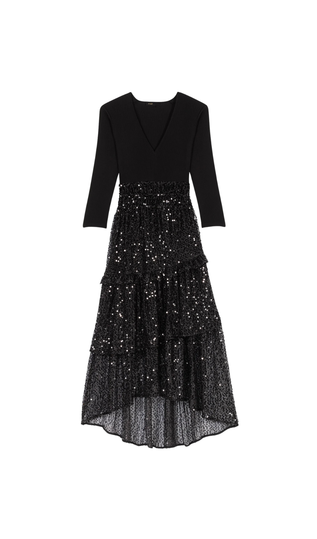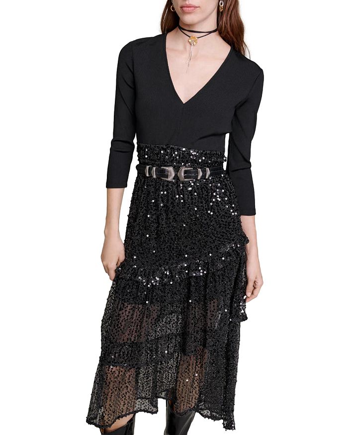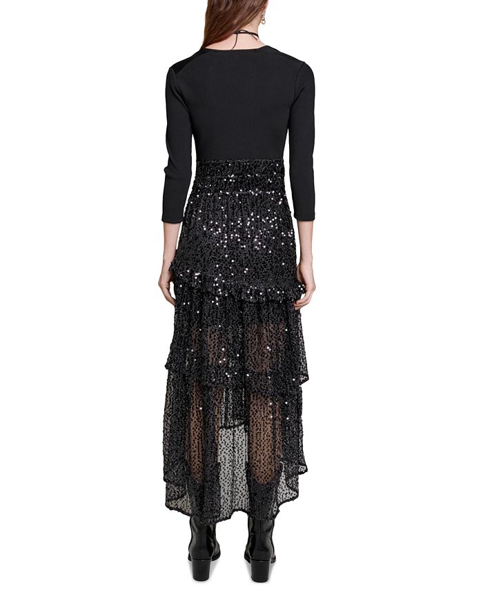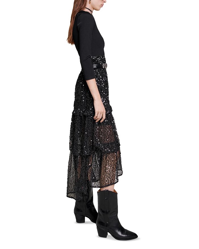 - Semi-sheer skirt with sequins, ruffles and asymmetric design