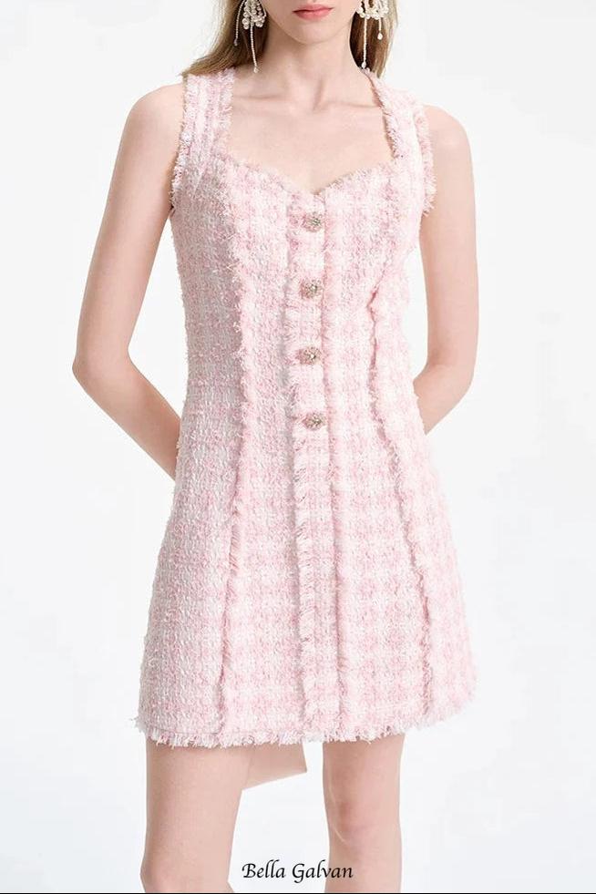 Elevate your wardrobe with this sophisticated pink mini dress, designed for those who appreciate refined tailoring. The striking square neckline frames the shoulders beautifully, while delicate tweed trim detailing adds texture and visual interest throughout. Cut to a flattering mini length, this piece transitions seamlessly from daytime elegance to evening occasions. The structured silhouette and quality construction ensure a polished appearance that commands attention. Perfect for fashion-forward individuals seeking a statement piece that balances contemporary style with timeless appeal.