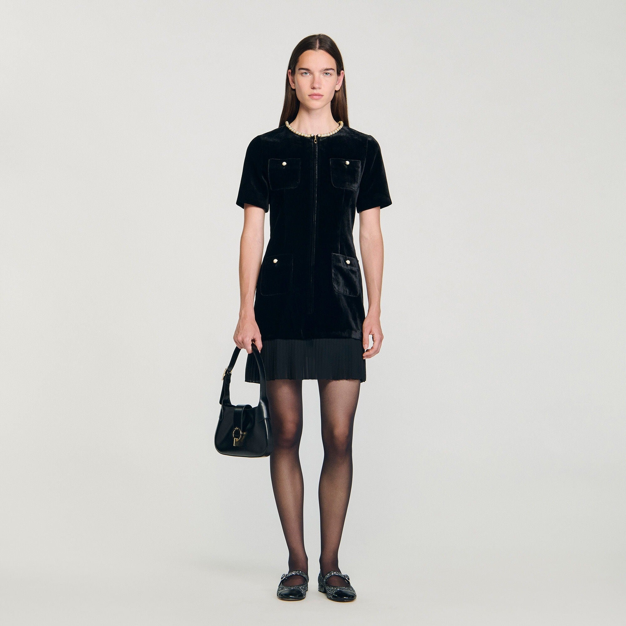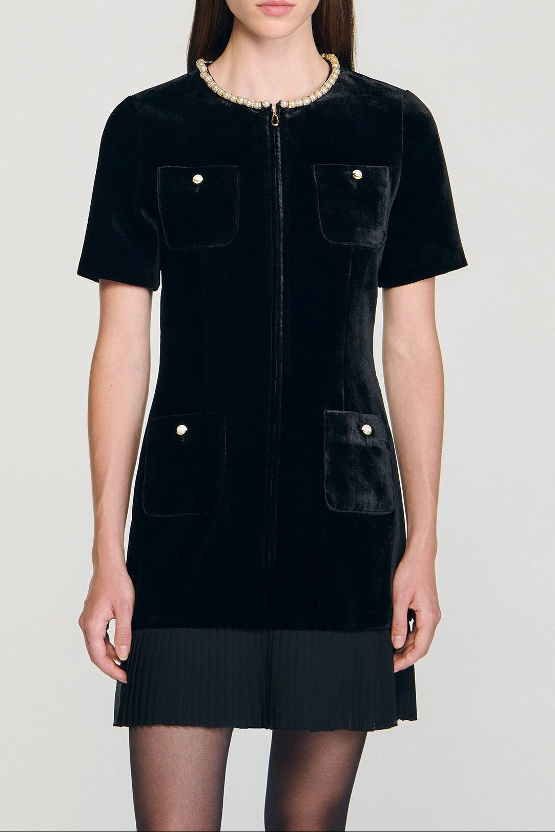 Pearl-trimmed collar zipper velvet pleated dress in black
