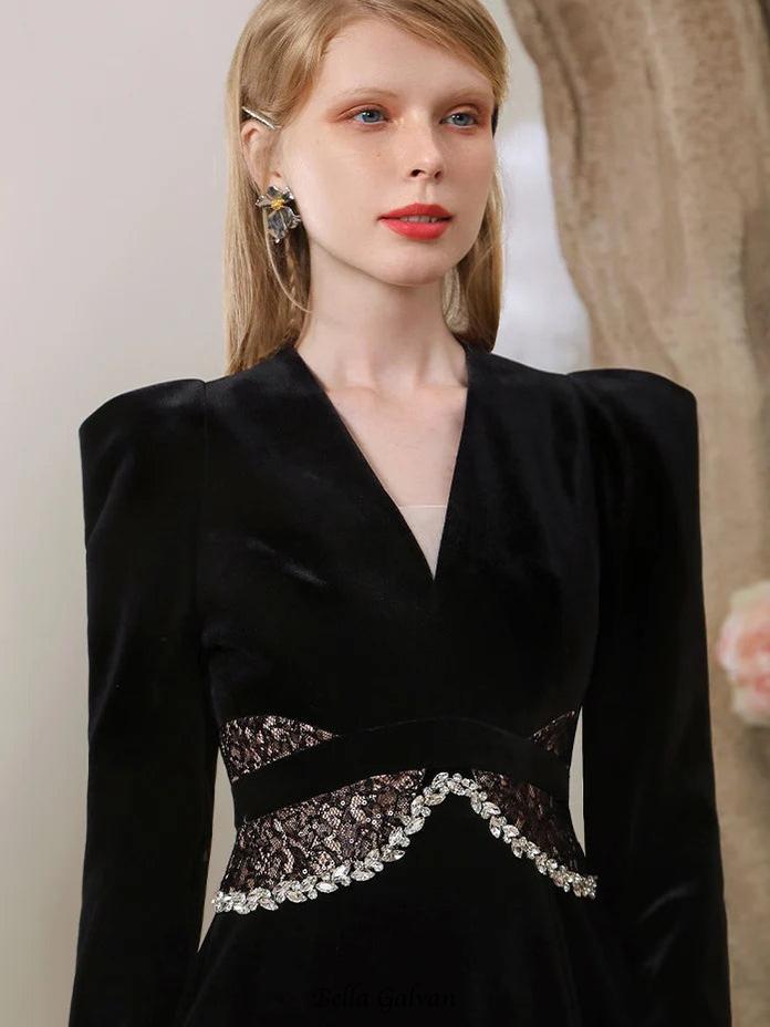 Quintina Black Lace V-Neck Asymmetry Mini Blazer Dress Elevate your evening wardrobe with this sophisticated mini blazer dress, expertly crafted from delicate black lace. The plunging V-neckline creates an alluring focal point, while the asymmetrical hemline adds contemporary edge and movement. Structured blazer tailoring provides polished definition, making this piece equally suited for cocktail events or upscale casual occasions. The lace fabrication offers refined texture and subtle transparency for visual interest. A versatile investment piece that transitions seamlessly from day to night with minimal styling adjustments.