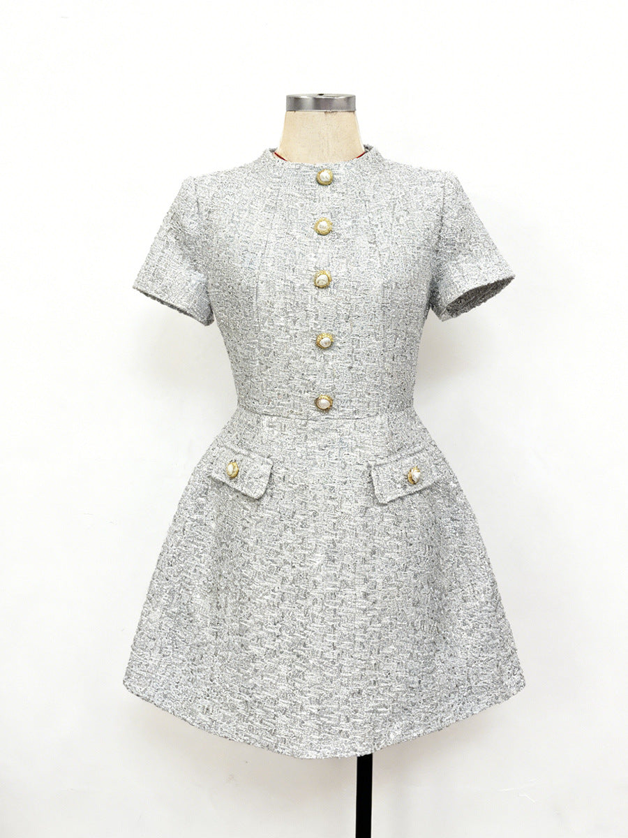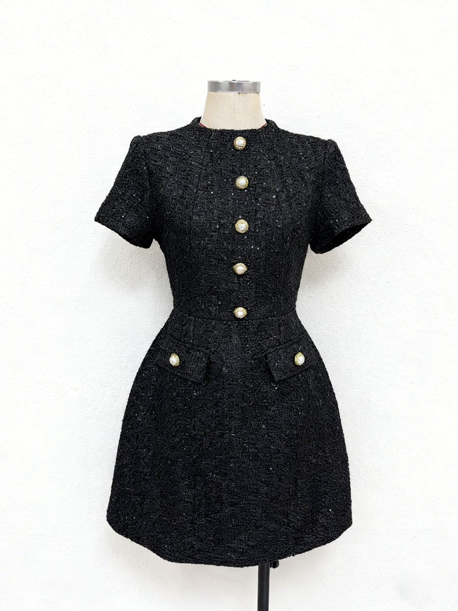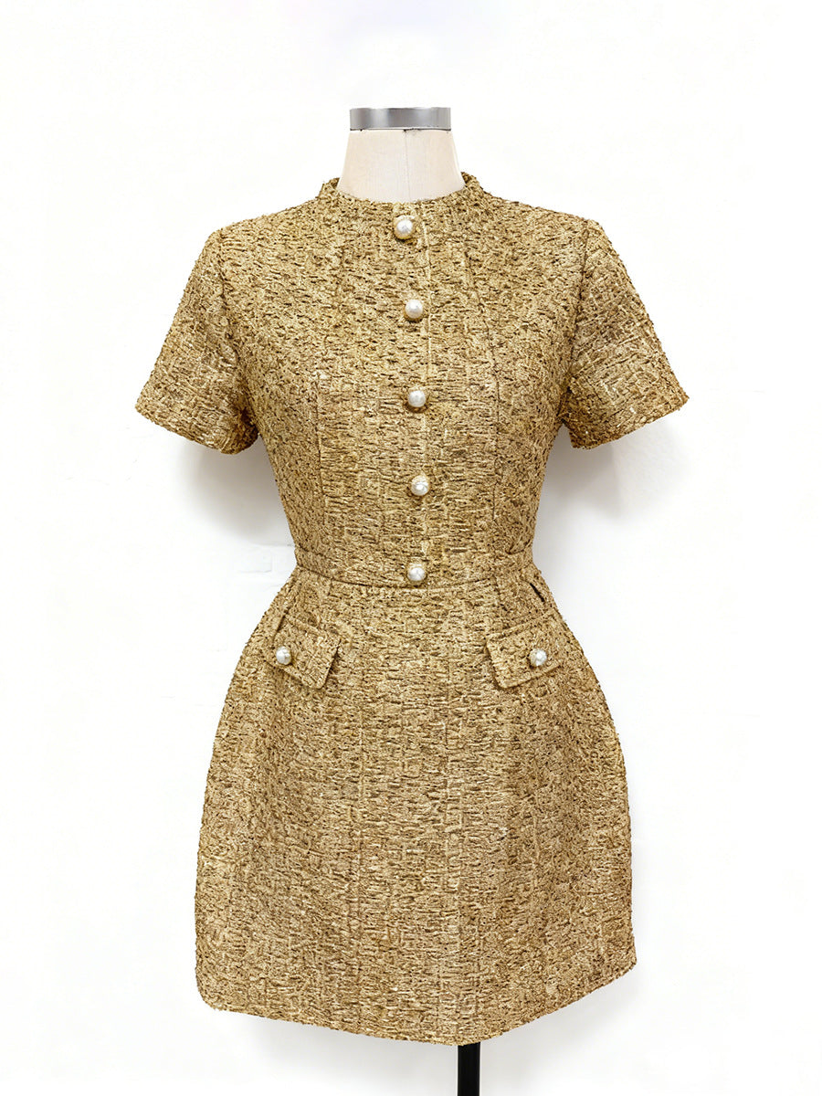 Elevate your evening repertoire with this sophisticated pearl-embellished tweed mini dress in lustrous gold. Crafted from premium tweed fabric, the dress features delicate pearl detailing that catches light beautifully, creating an understated yet refined aesthetic. The structured silhouette flatters the figure while the mini length offers contemporary appeal. Perfect for cocktail events, upscale gatherings, or special occasions where polished elegance is paramount. The timeless gold tone pairs effortlessly with metallic accessories and classic heels for a cohesive, high-impact look.