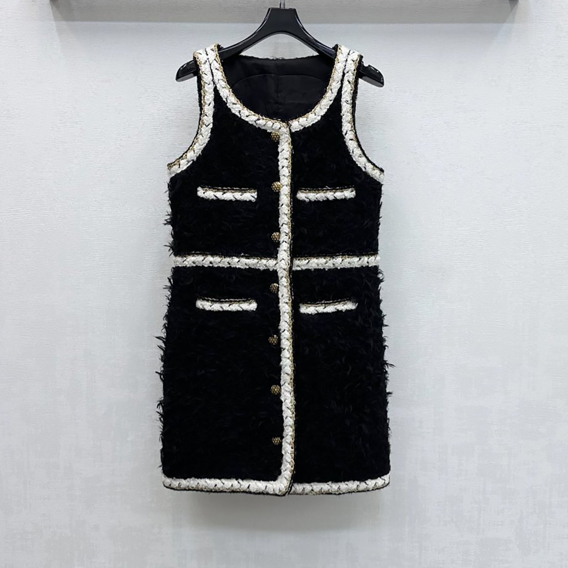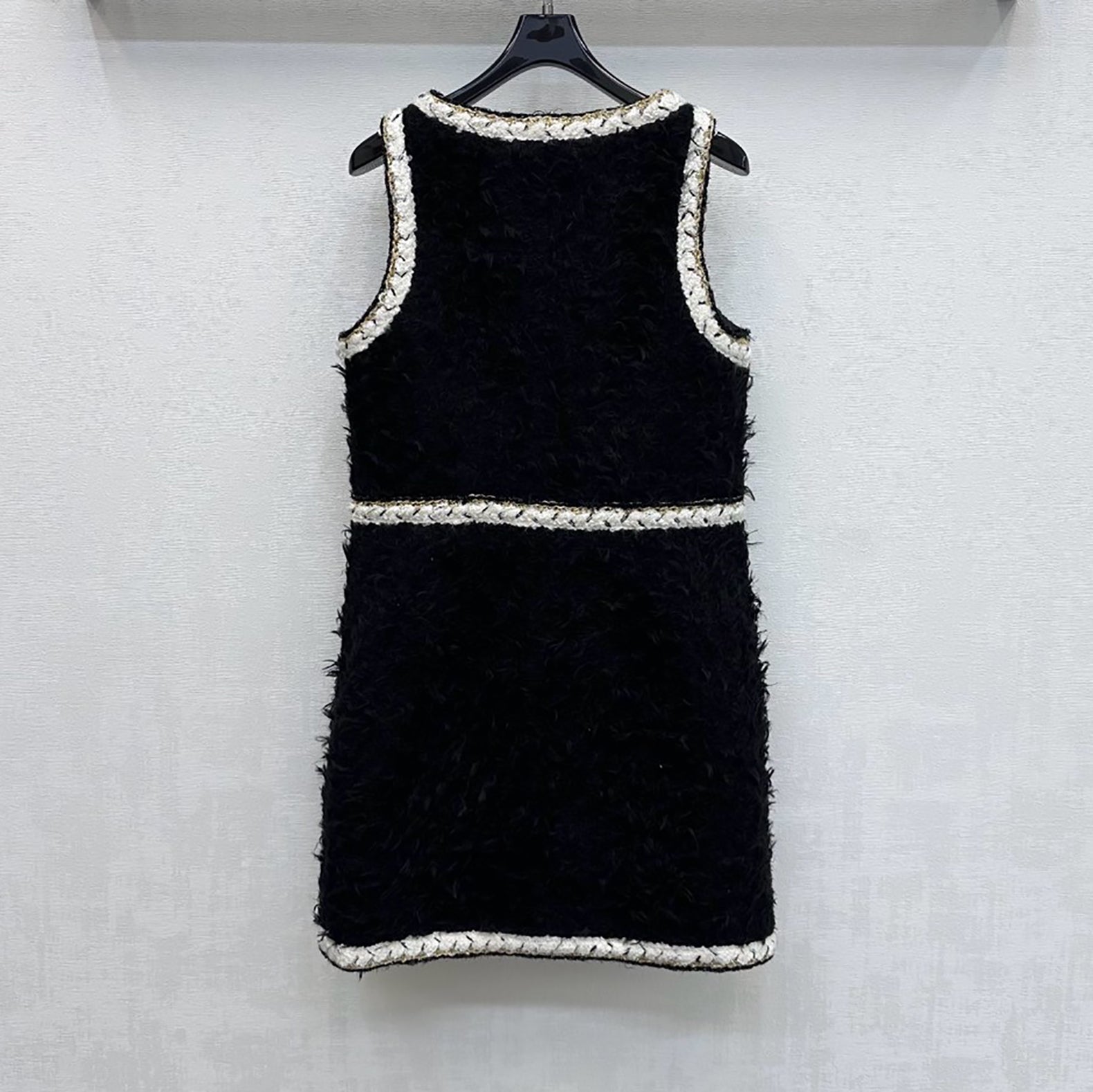 Elevate your wardrobe with this timeless wool tweed sleeveless short dress in classic black. Crafted from quality wool tweed fabric, this piece offers both sophistication and comfort for any occasion. The sleeveless design provides versatility—layer it with a blazer for the office or pair it with tights and boots for weekend outings. The flattering short length works beautifully on various body types, while the structured tweed material ensures a polished, put-together look. Perfect for those who appreciate enduring style and quality craftsmanship.