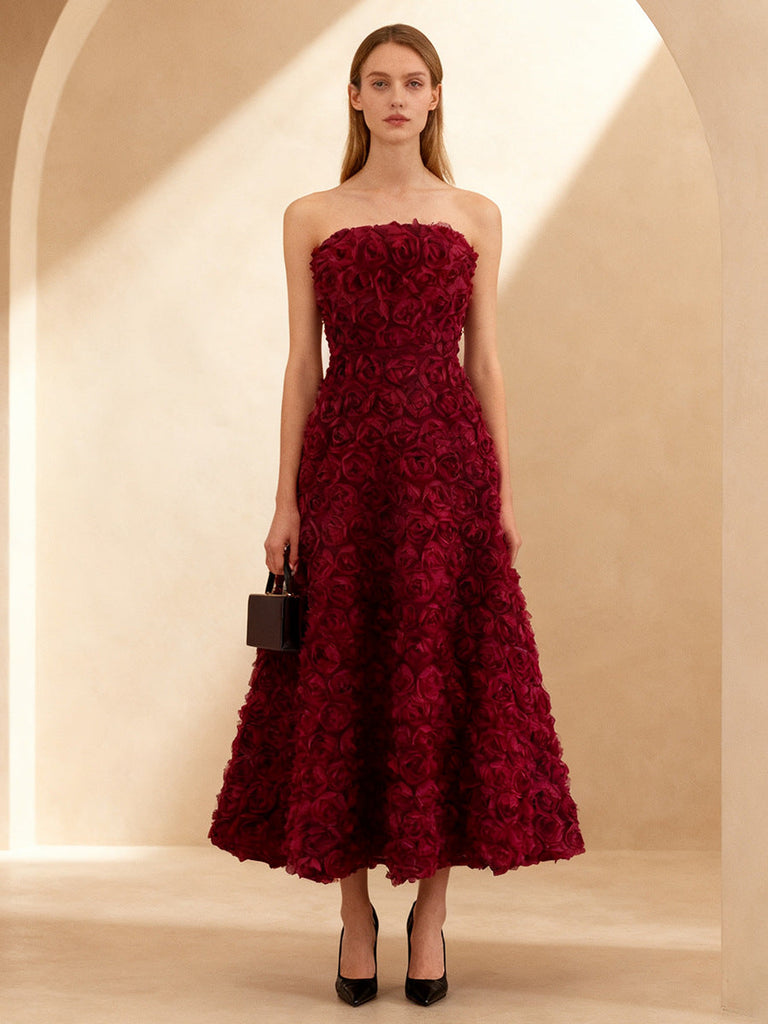 Elevate your evening wardrobe with this striking strapless maxi dress, featuring meticulously crafted 3D rose petals that create dimensional texture across sheer mesh fabric. The wine red hue delivers sophisticated elegance, while the strapless silhouette offers a refined, modern aesthetic. The flowing maxi length provides graceful movement and versatile styling for formal events, galas, or upscale occasions. Premium mesh construction ensures breathability without compromising the dress's dramatic visual impact. A timeless piece that balances architectural design with wearable luxury.