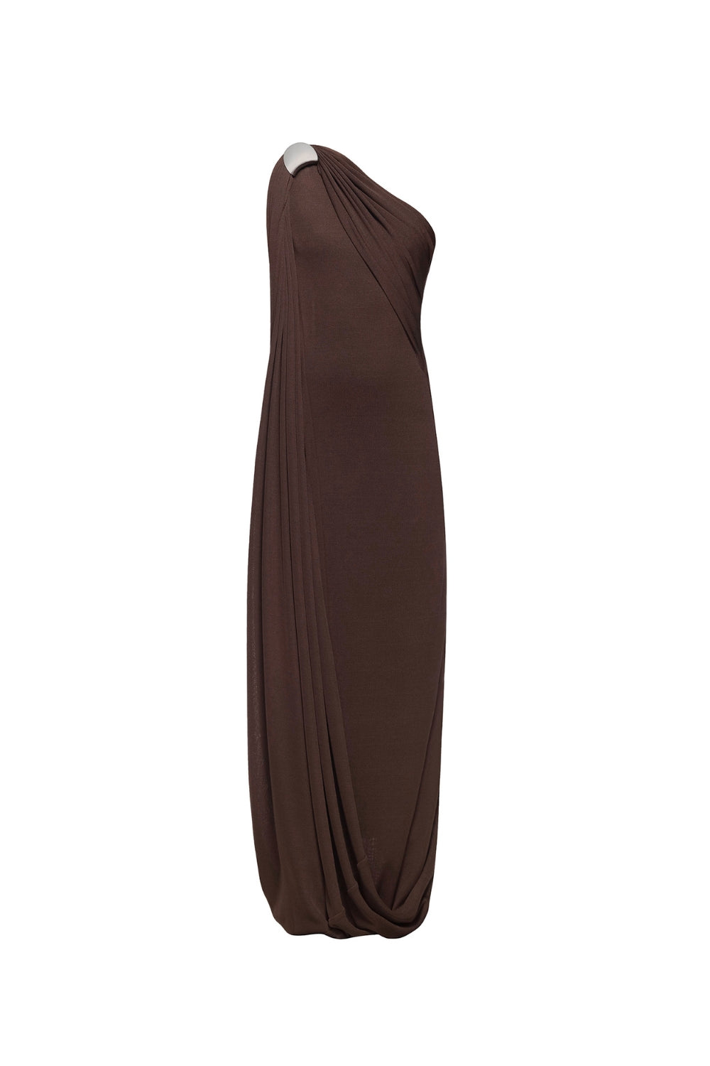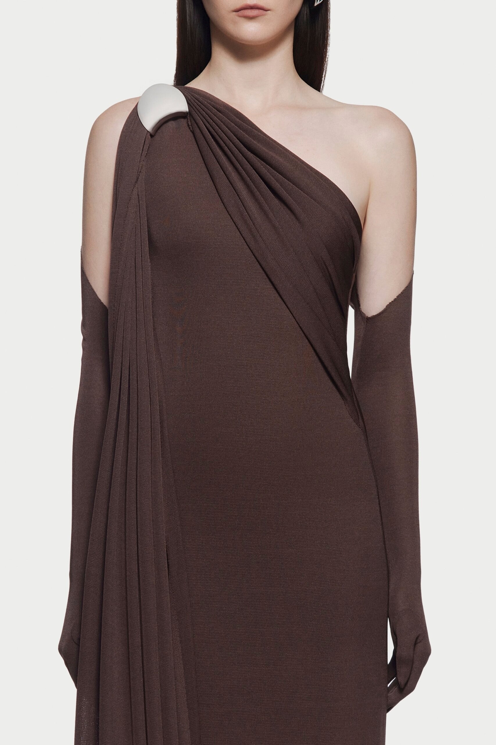 The Xaviera one-shoulder pleated backless maxi dress commands attention with its sophisticated silhouette. The asymmetrical neckline and dramatic open back create an elegant, fashion-forward aesthetic perfect for evening events or upscale occasions. Intricate pleating adds dimension and movement throughout the floor-length design, while the rich brown tone offers versatility and timeless appeal. This statement piece balances bold architectural details with refined simplicity, making it an investment piece for those who appreciate contemporary design with understated luxury.