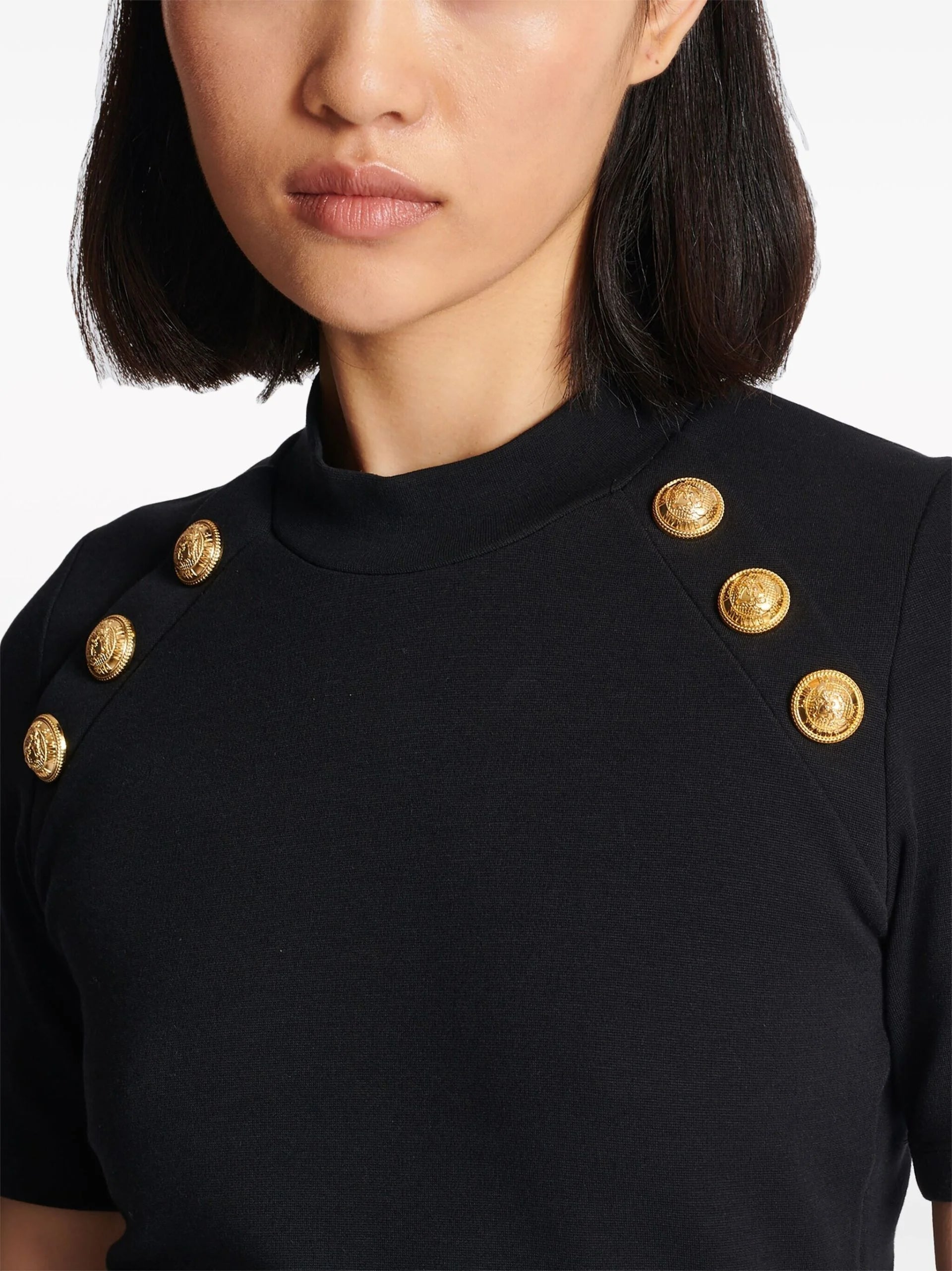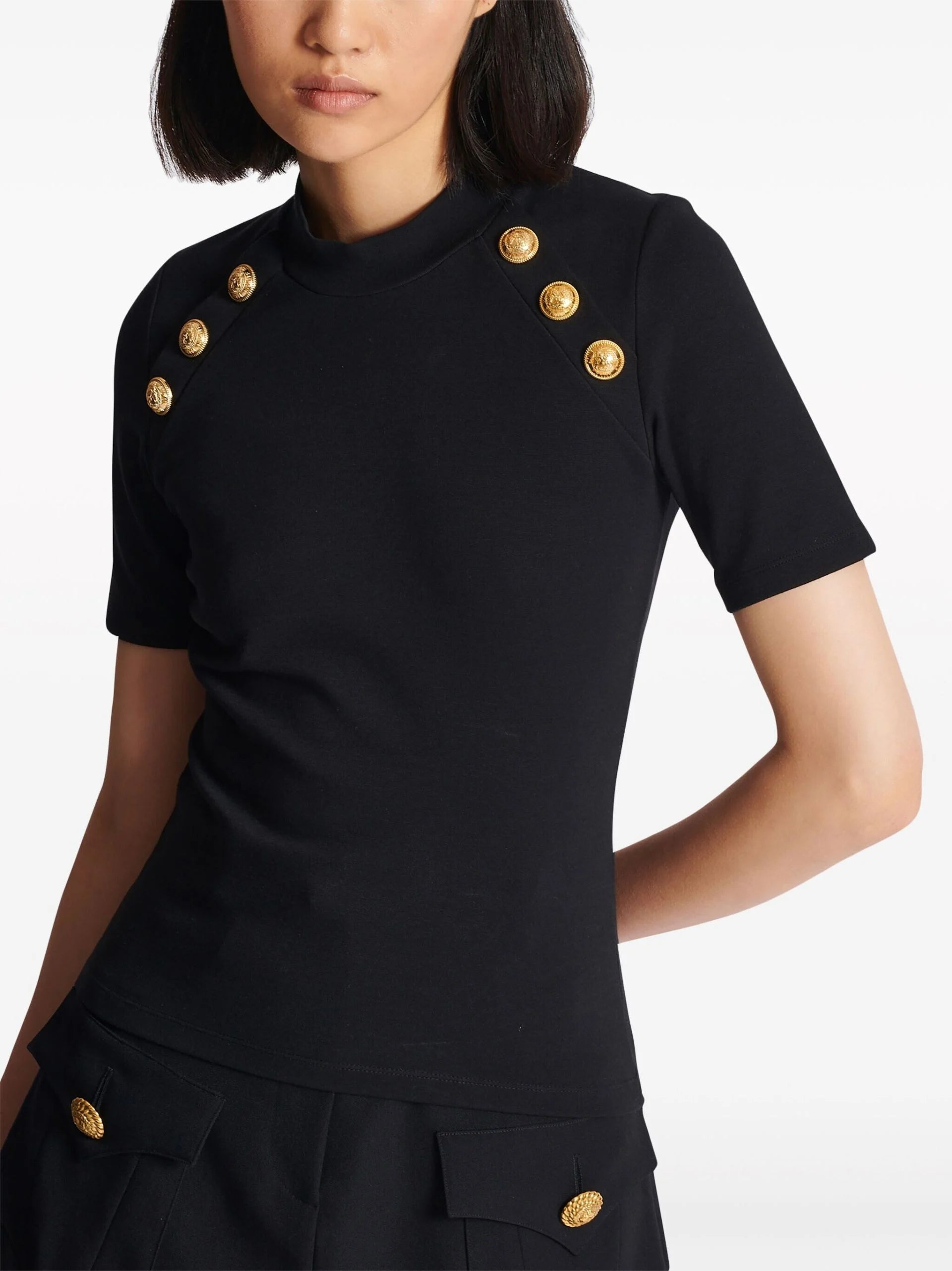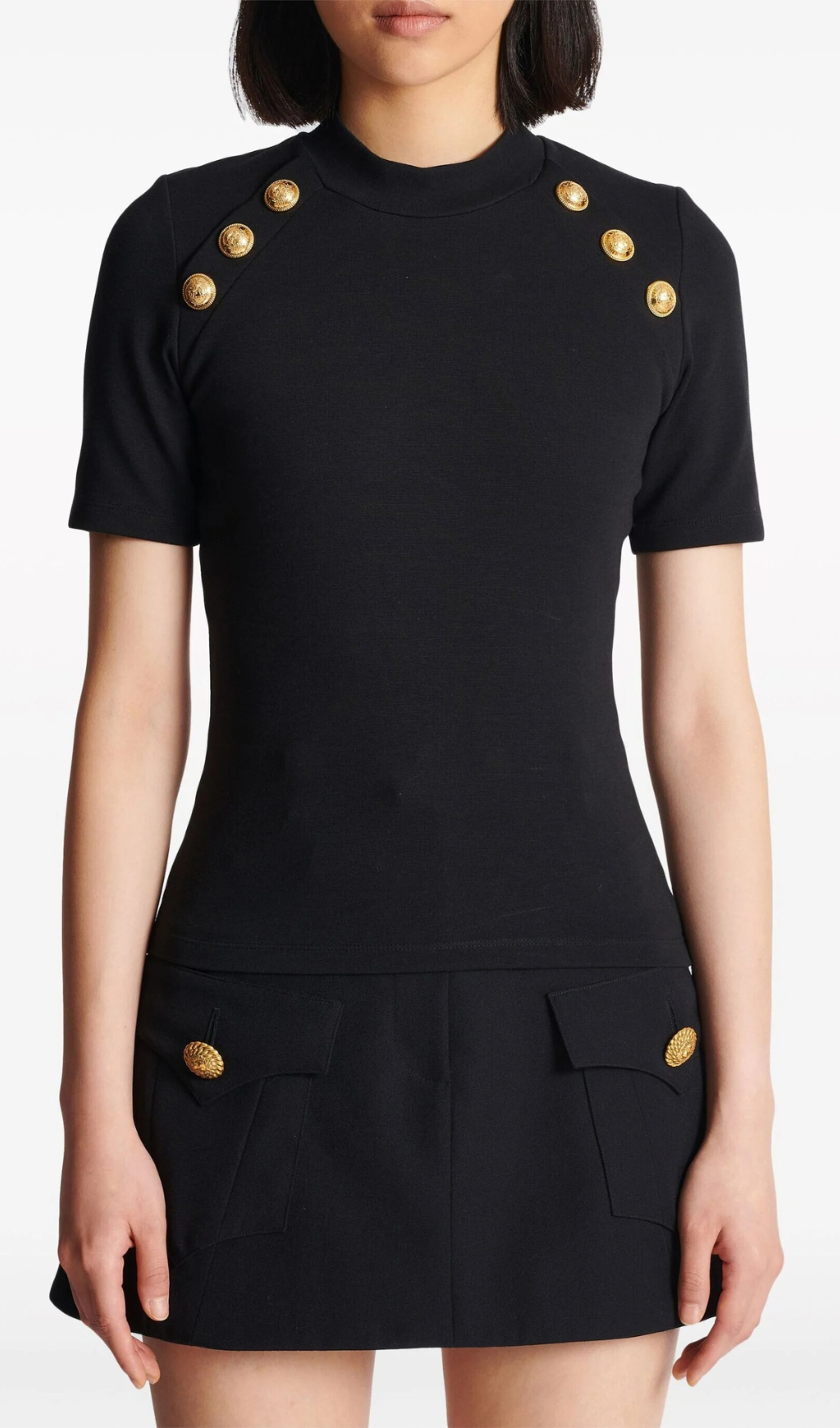 BLACK BUTTON-EMBELLISHED KNITTED T-SHIRT