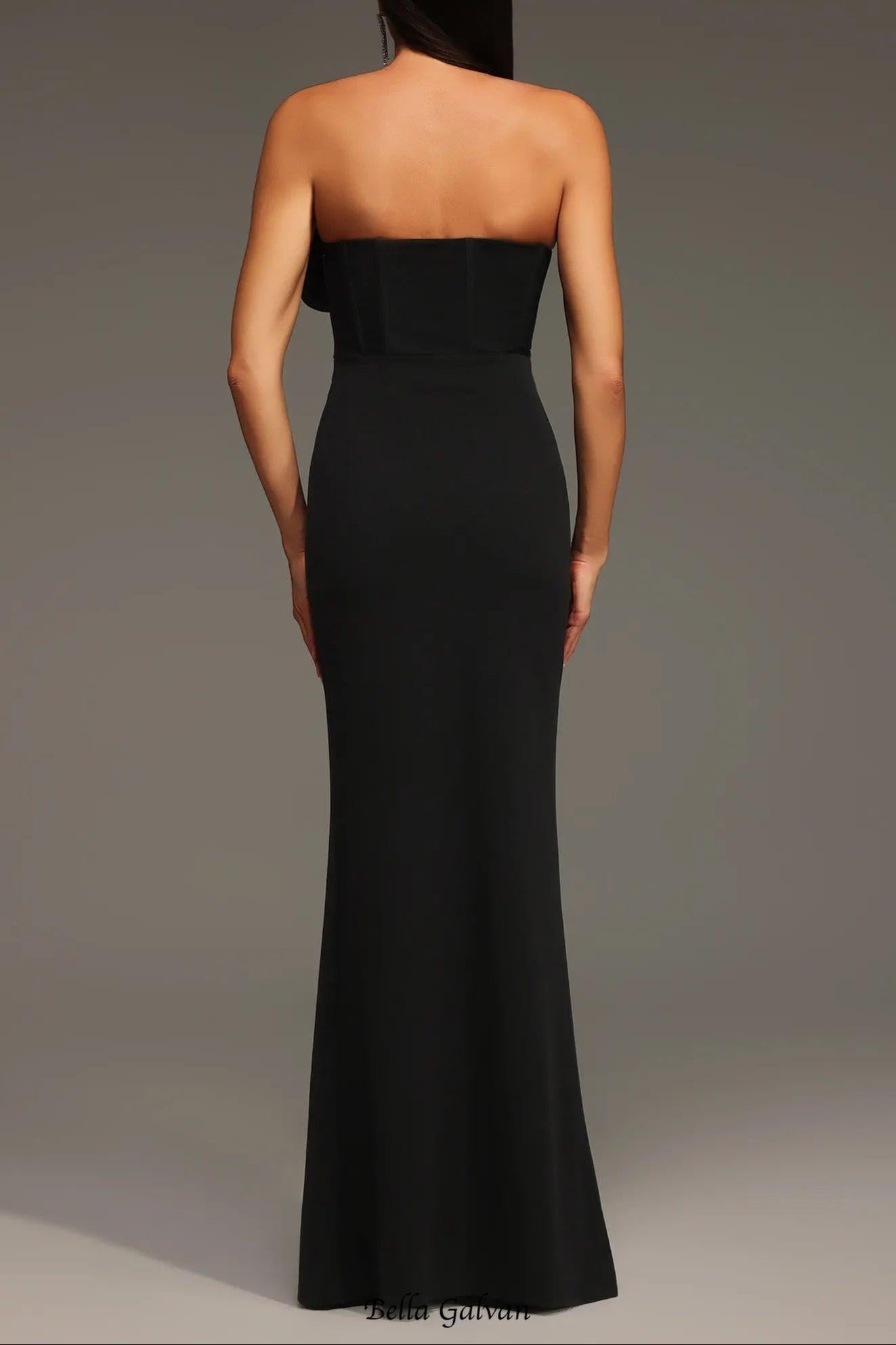 This black Heloise Flowers slit strapless bandage maxi dress combines sophisticated design with modern elegance. Crafted with contouring bandage fabric, it offers a flattering fit that enhances your silhouette. The strapless neckline and thigh-high slit provide a striking balance of boldness and refinement, making it ideal for formal events or evening occasions. Floral accents add a subtle touch of femininity to this sleek and stylish statement piece.