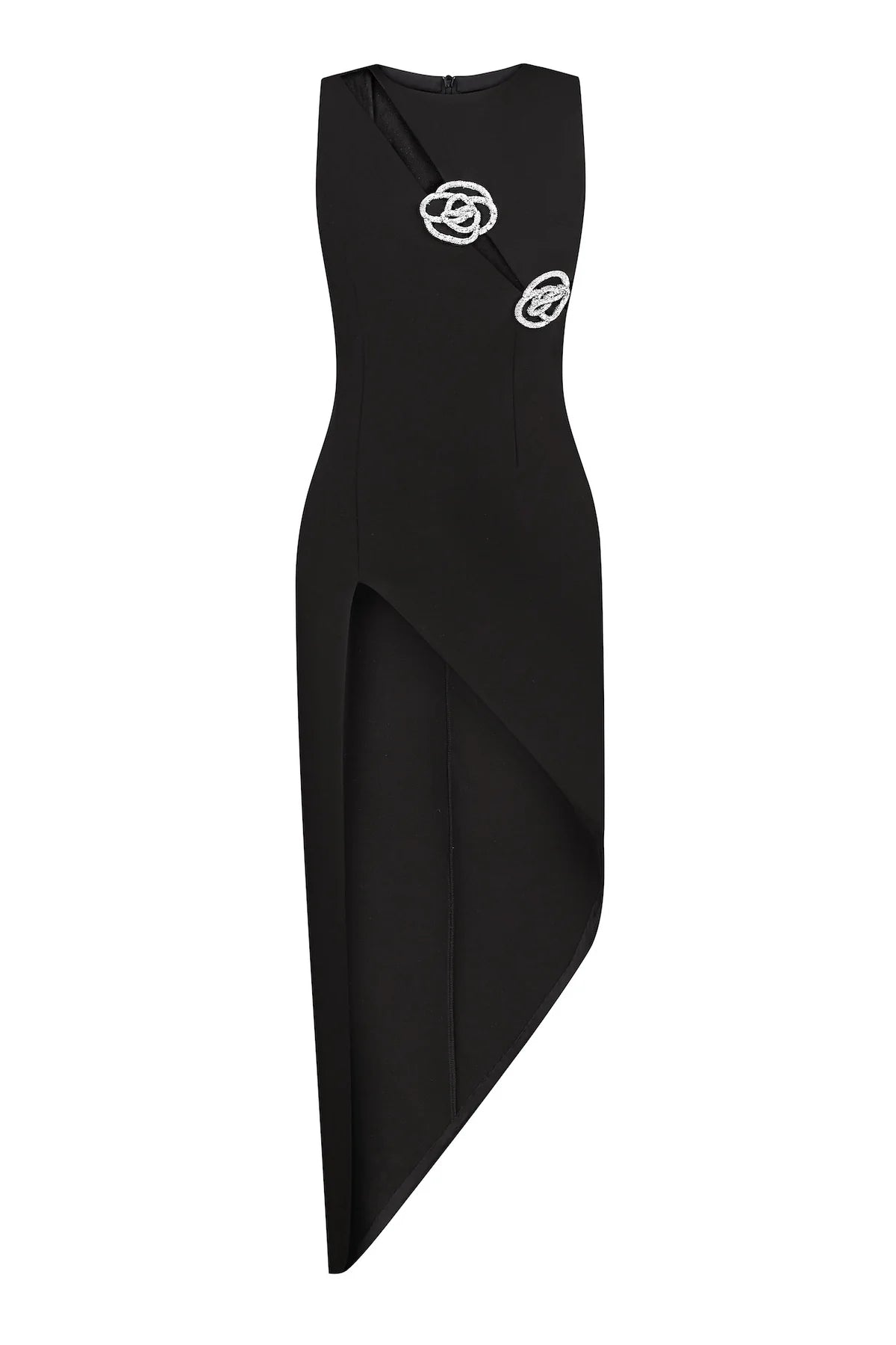 Elevate your evening wardrobe with the Crystal Rose Detailed High-Slit Black Dress. Expertly crafted, this dress features intricate crystal rose embellishments that add refined elegance. The high slit design offers a sophisticated yet daring silhouette, enhancing movement and presence. Perfect for formal occasions, it combines timeless black fabric with detailed artistry to create a statement piece that balances grace and allure.