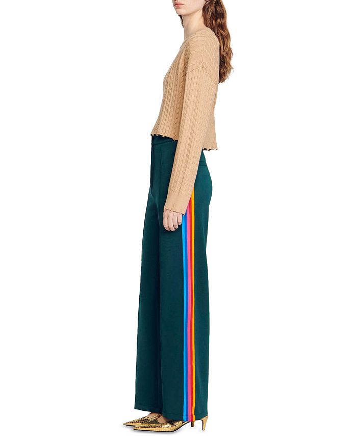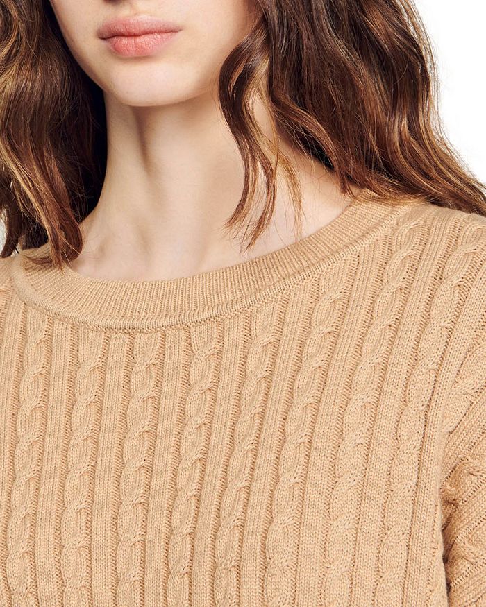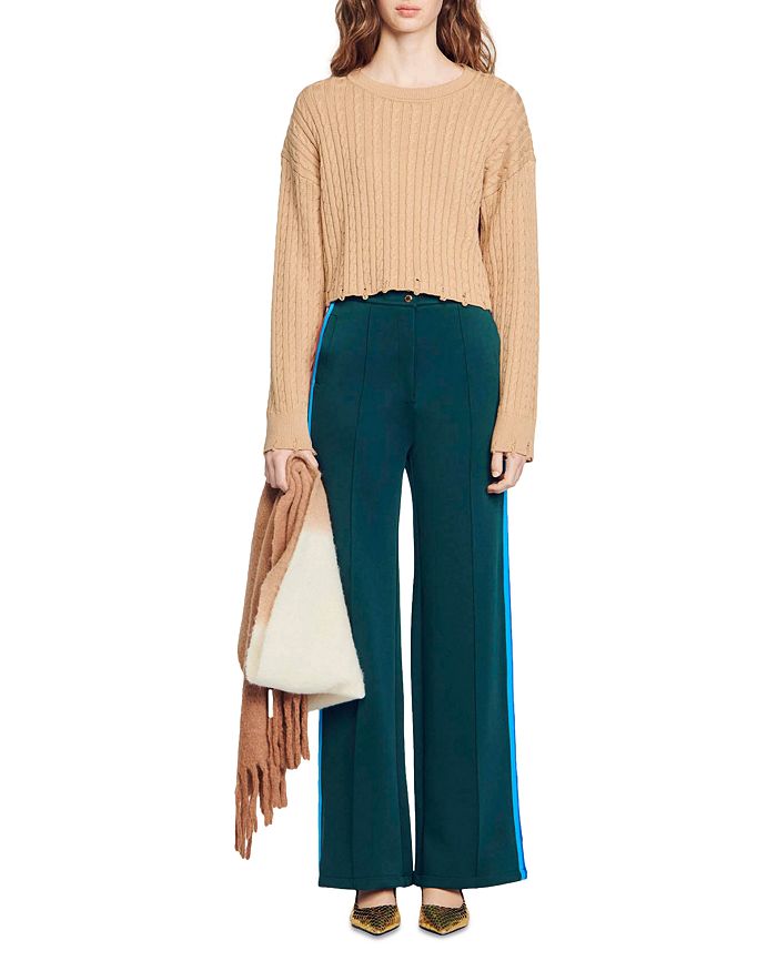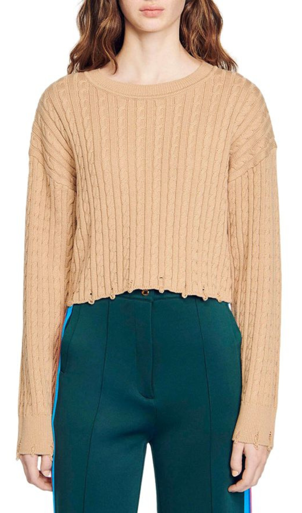 - Allover cable knit with distressed hem detailing