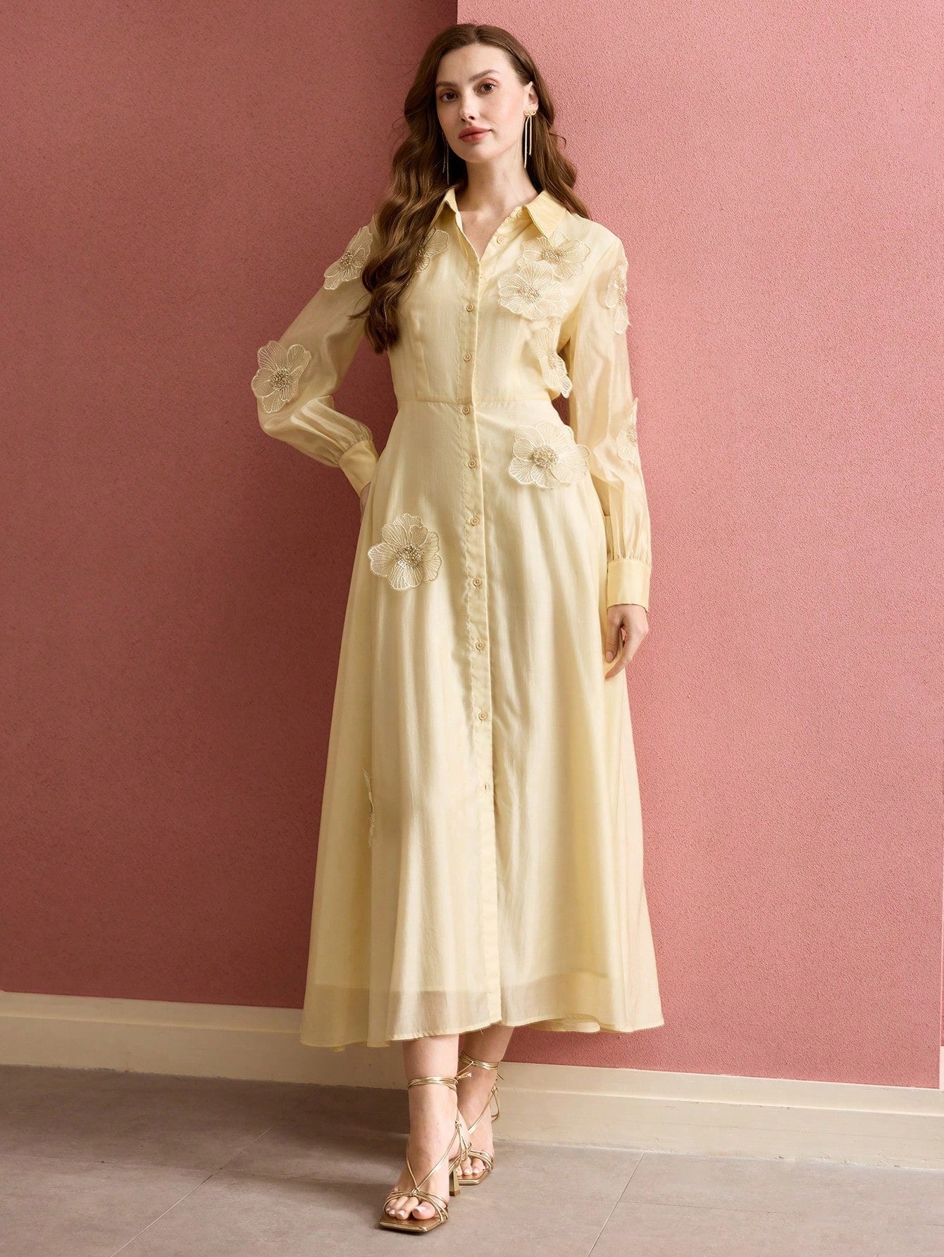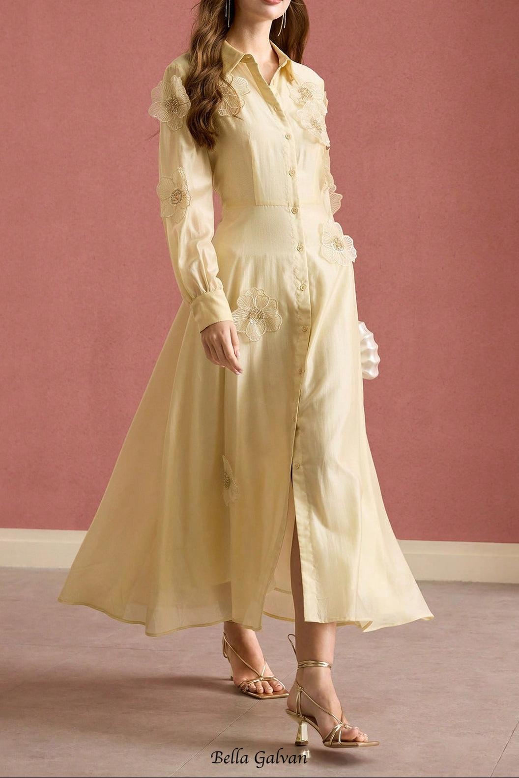 Elevate your wardrobe with the Susanna Floral Applique Shirt Midi Dress in yellow. This sophisticated piece seamlessly blends classic shirt styling with an elegant midi silhouette, creating a versatile option for both professional and casual settings. The intricate floral appliqué detailing adds refined texture and visual interest, while the cheerful yellow hue brings warmth and brightness to any occasion. Crafted with attention to detail, this dress offers the structured comfort of a shirt combined with the graceful flow of a midi length, making it an essential addition to your collection.