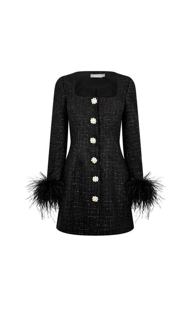 BLACK FEATHER-DETAILED BOUCLÉ MINI DRESS