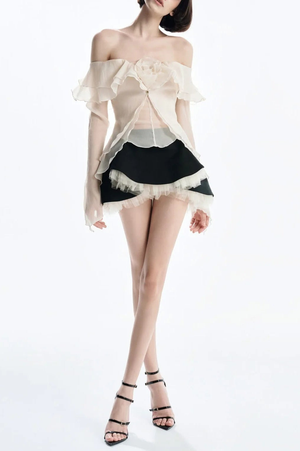 apricot One-shoulder tube top with backless ruffled mesh skirt set