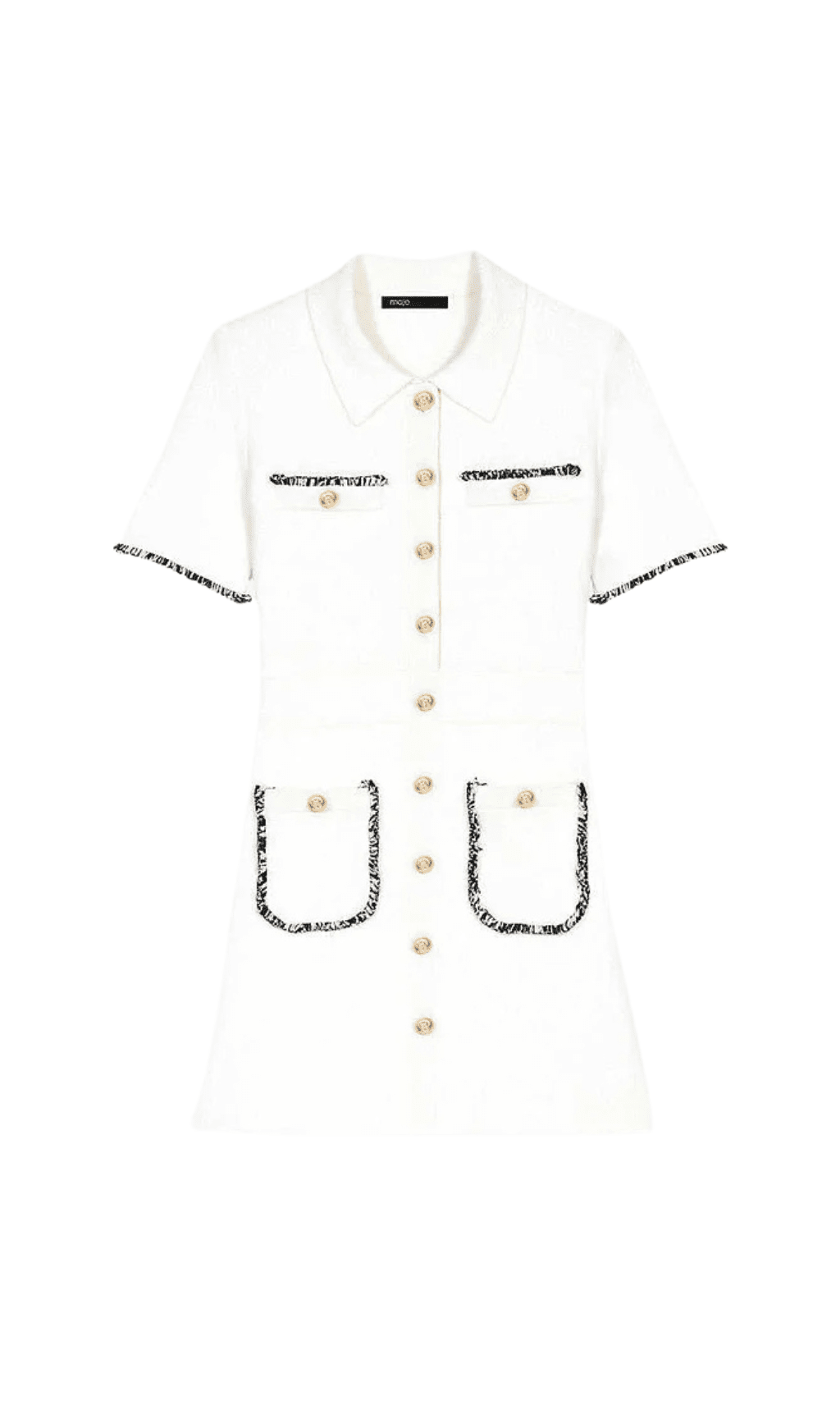 The contrast trim adds a fun twist to the classic button front design. Stand out from the crowd and make a statement with this unique dress. (No buttons were harmed in the making of this dress!)"