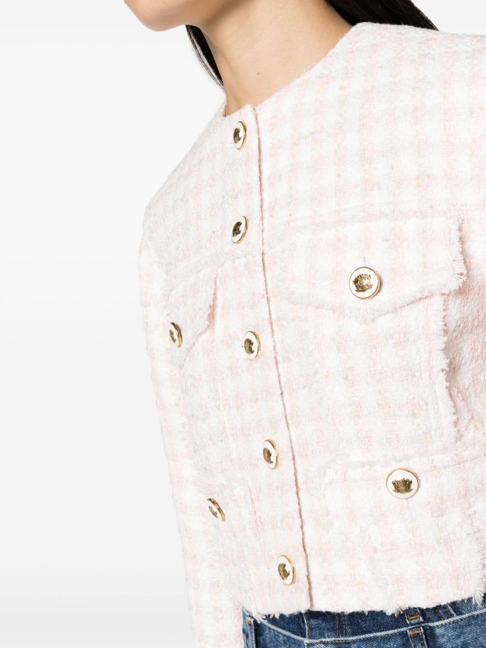 Crafted with intricate tweed and detailed with elegant buttons, this jacket exudes sophistication. The cropped design adds a touch of modernity, making it the perfect addition to any stylish wardrobe. Elevate your style with this exclusive piece.