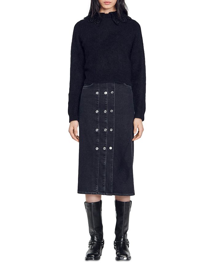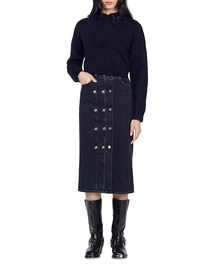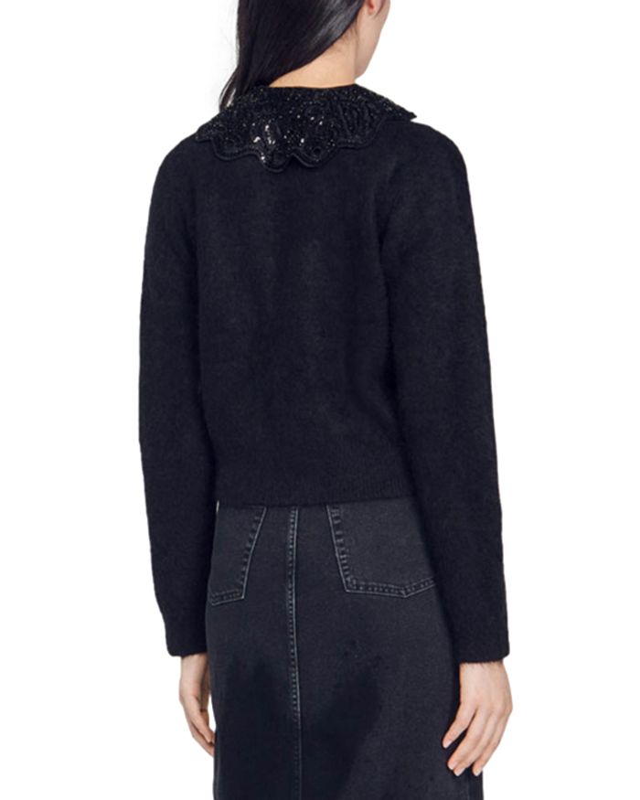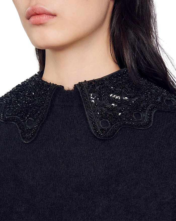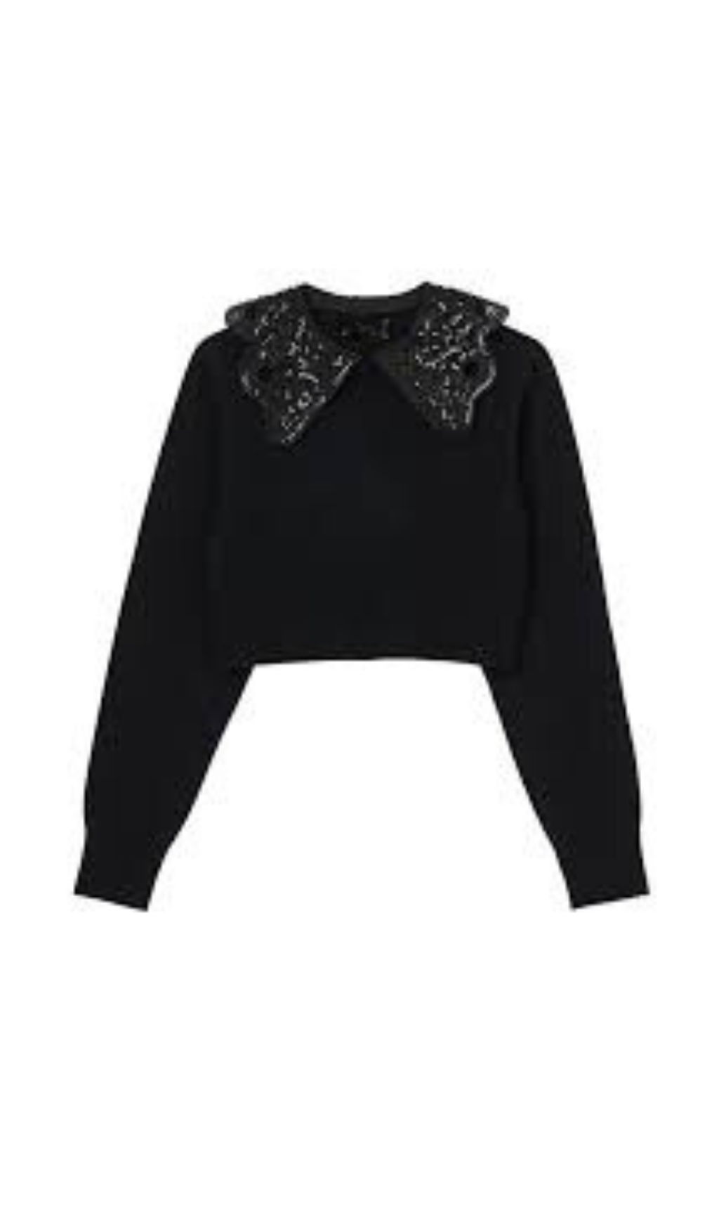 This sweater features a stunning embellished collar that will add a touch of glamour to any outfit. Stay warm and chic with this must-have addition to your wardrobe. Perfect for any occasion, from work to a night out!