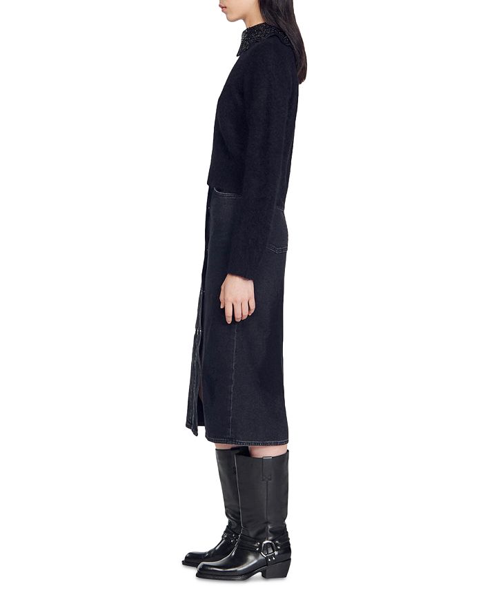 - Main: 55% alpaca wool/24% acrylic/19% polyamide/2% elastane; removable collar: 100% polyester; beads: 100% glass; collar stand: 100% cotton; sequins: 100% polyethylene