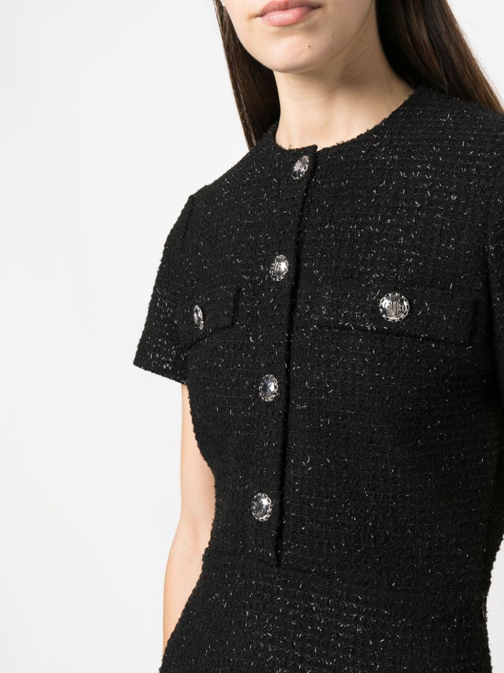 This dress features a flared design and tweed fabric, giving you a bold and adventurous look. Perfect for those who like to take risks and stand out from the crowd!"