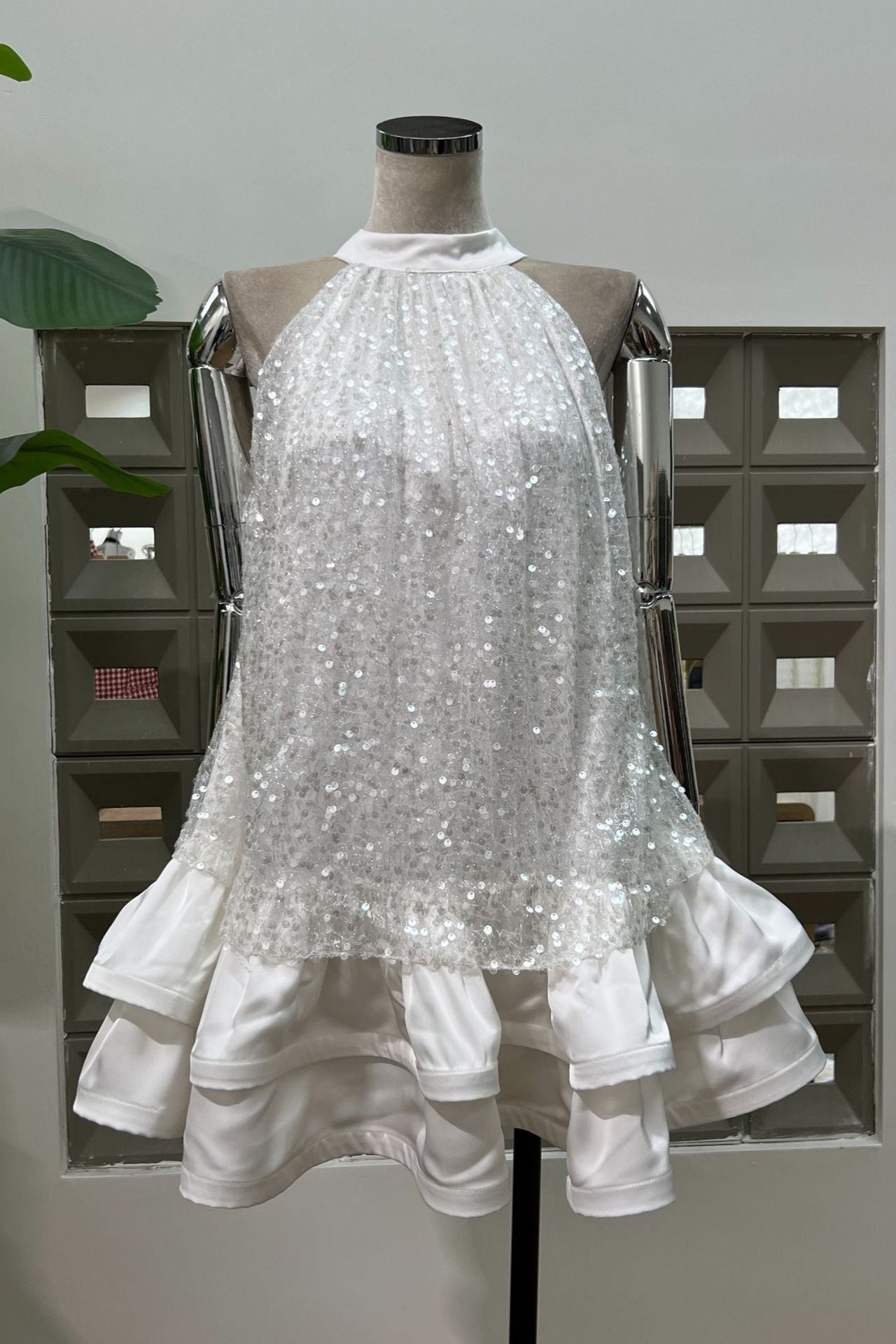 gemma sequin Sleeveless Bowknot Mini Dress in white