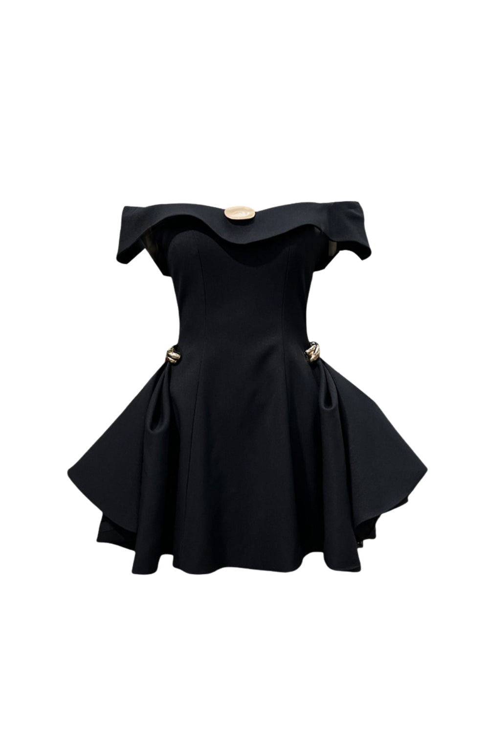 Elevate your style with this black a-line mini dress featuring striking metal detailing and an elegant off-shoulder design. The flattering A-line silhouette enhances movement and comfort, while the metallic accents add a modern edge, perfect for sophisticated evening events or stylish daytime occasions. Crafted to balance boldness with refined tailoring, this dress seamlessly combines contemporary flair with timeless appeal.