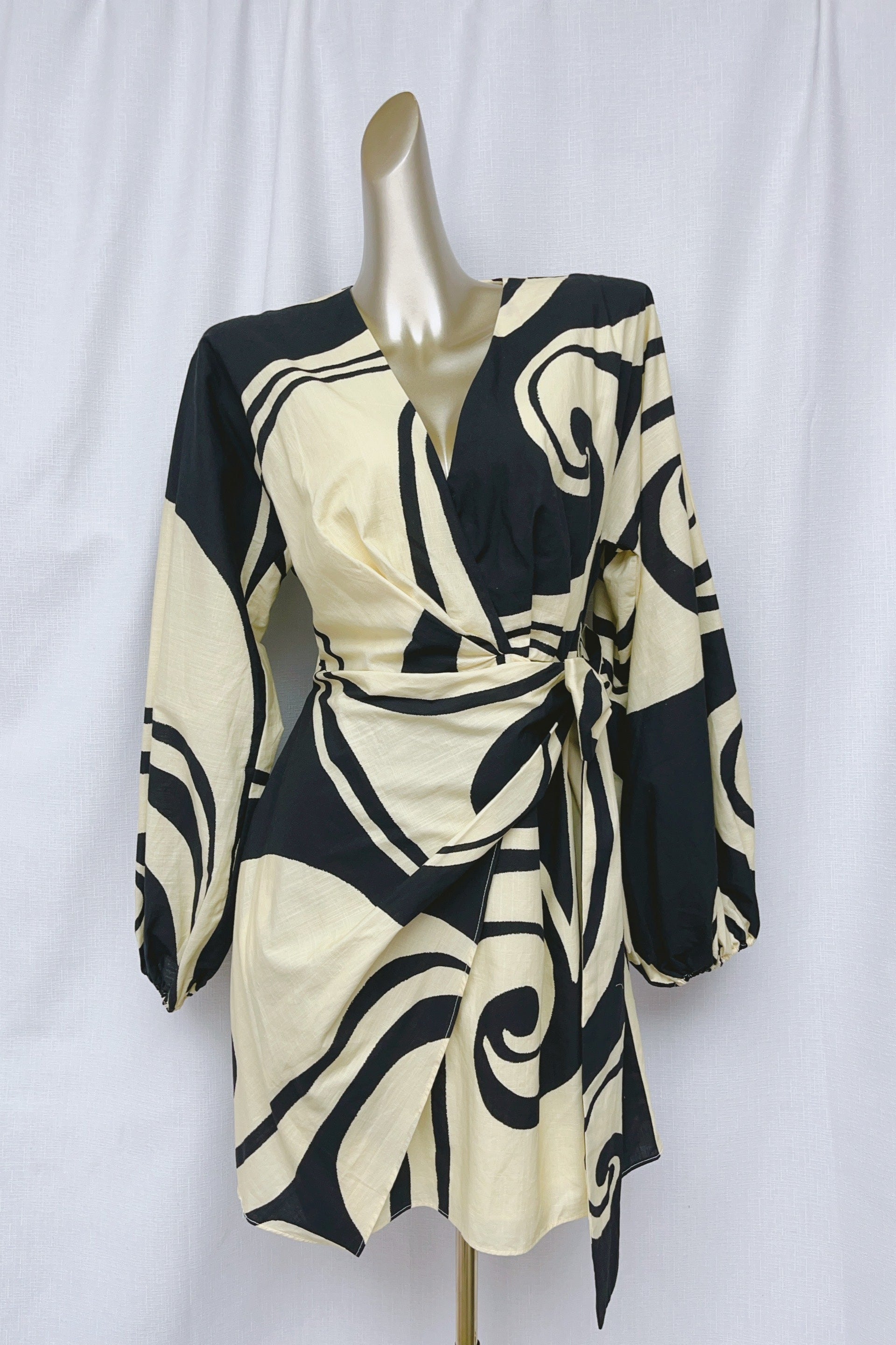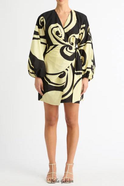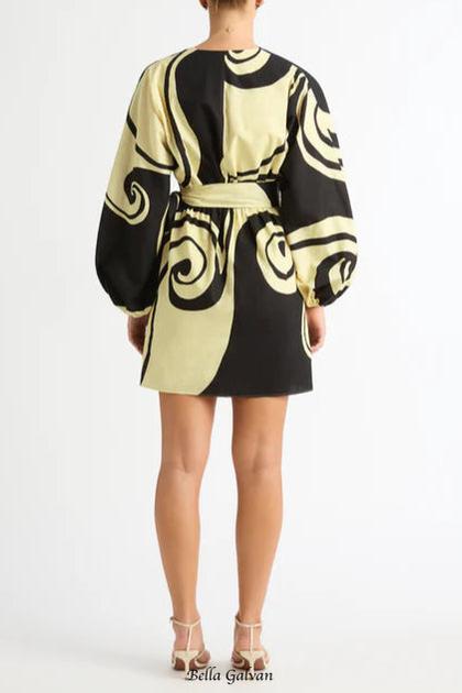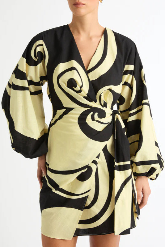 oceanic swirl v-neck puff sleeve mini dress