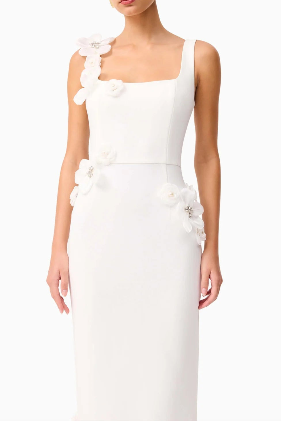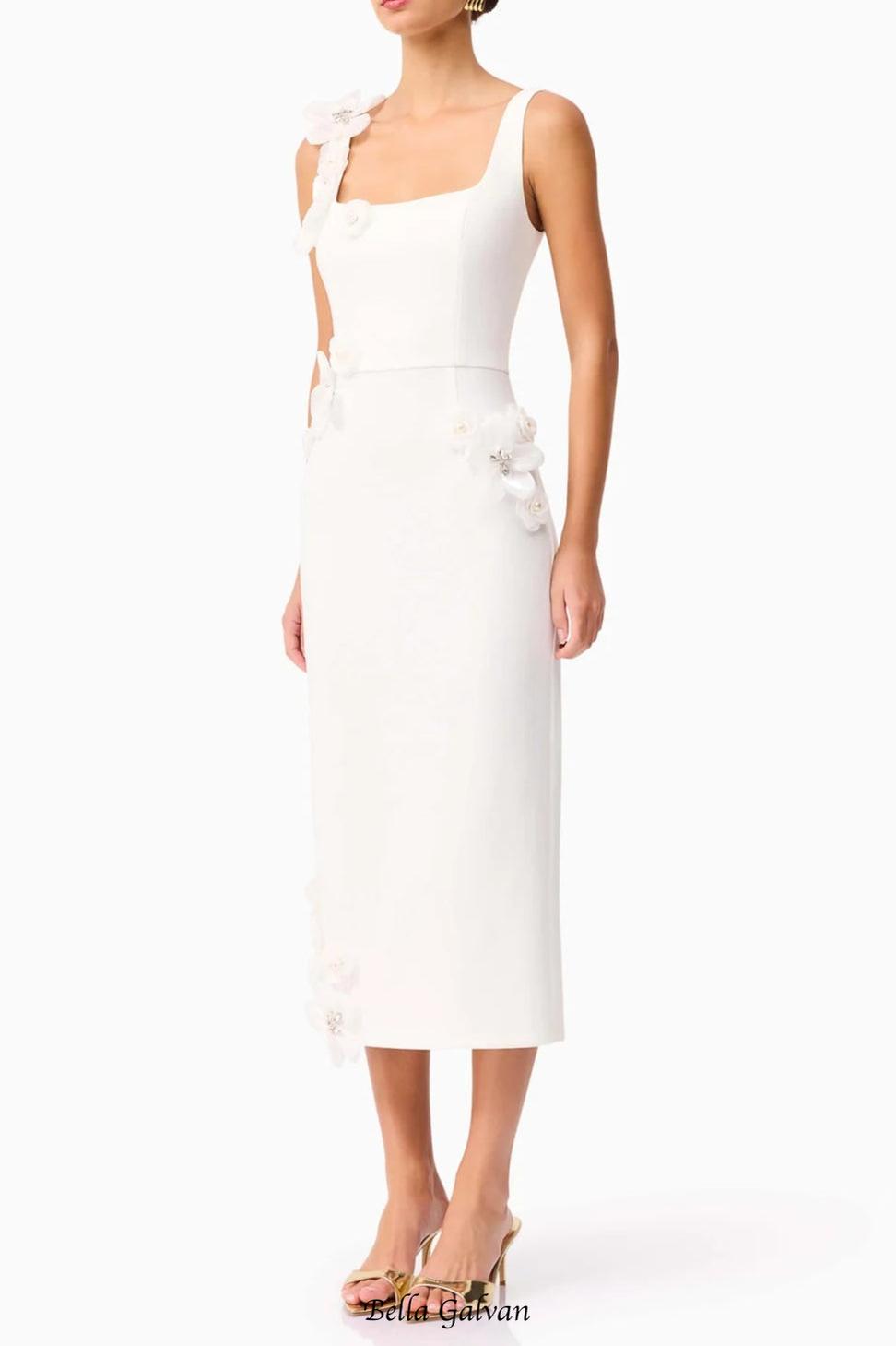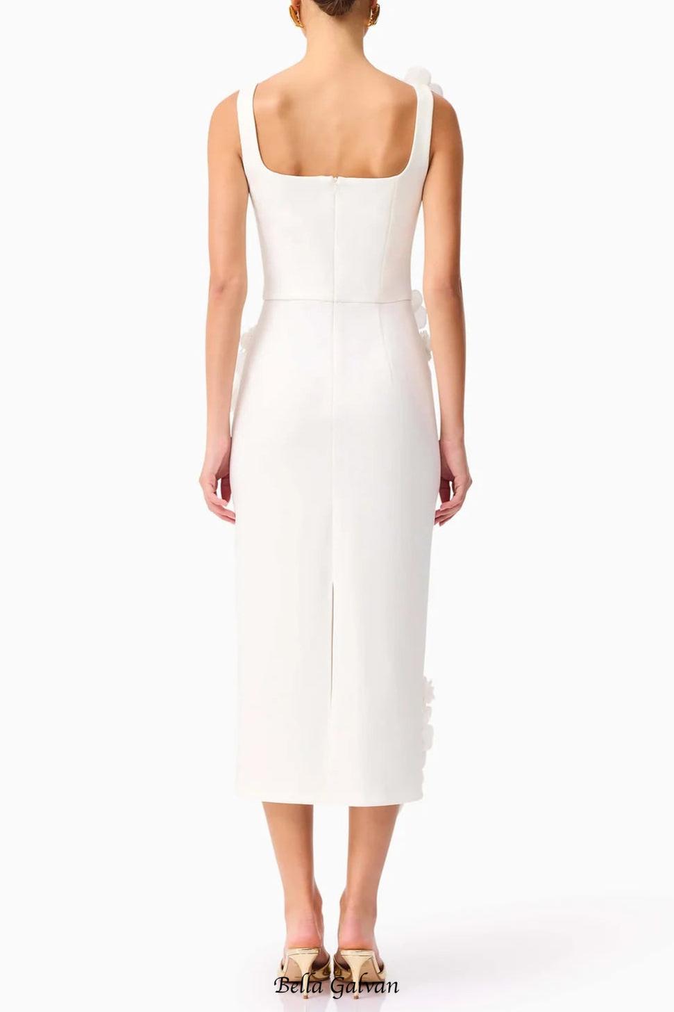 Elevate your wardrobe with the Sabrina 3D Flower Midi Dress in white. Expertly crafted, this dress features delicate three-dimensional floral accents that add a sophisticated texture and visual interest. The midi length offers a refined silhouette, perfect for both formal occasions and stylish daytime events. Its clean white fabric enhances the intricate flower detailing, creating a balanced look of elegance and modern design. Ideal for those seeking a statement piece that combines artistry and wearable comfort.