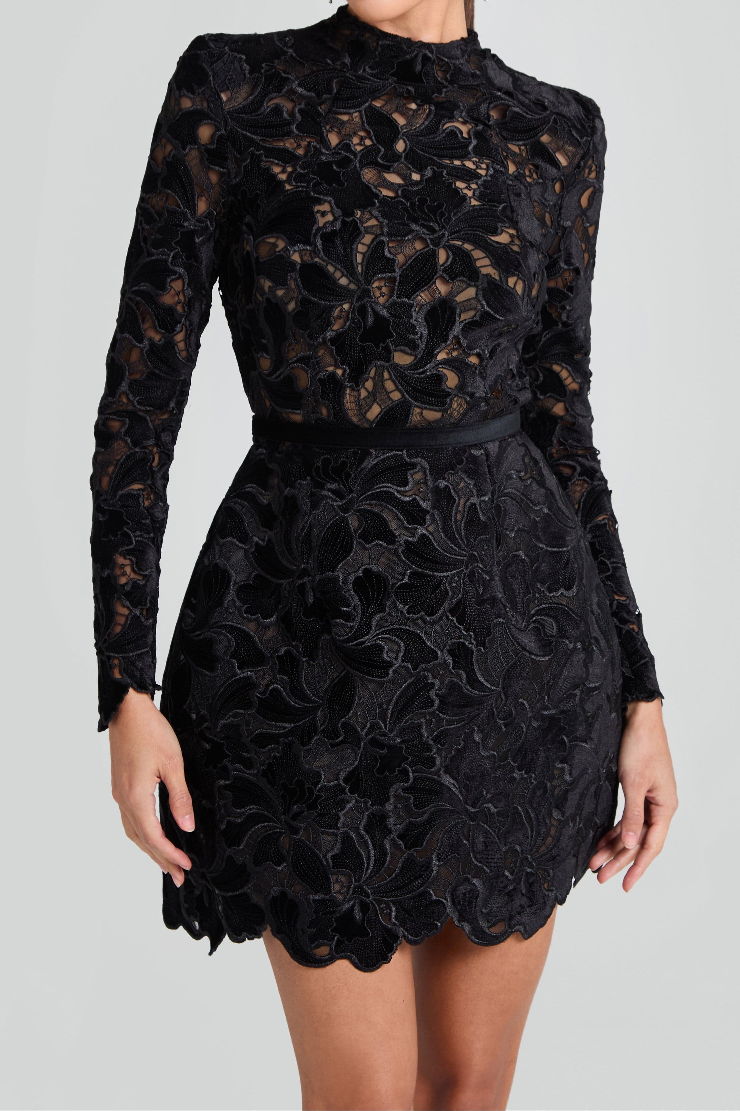 The LYDIA Black Dress is a statement mini dress crafted from sheer black velvet embroidered lace, that reveals a subtle hint of skin. This lace dress features a high neckline, shoulder pads, and our signature tulip mini skirt for a defined silhouette. Finished with elegant scallop detailing for an ultra-feminine finish. Complete with a concealed zip closure to the back for a smooth fit and a detachable satin fabric belt for adaptable elegance.
