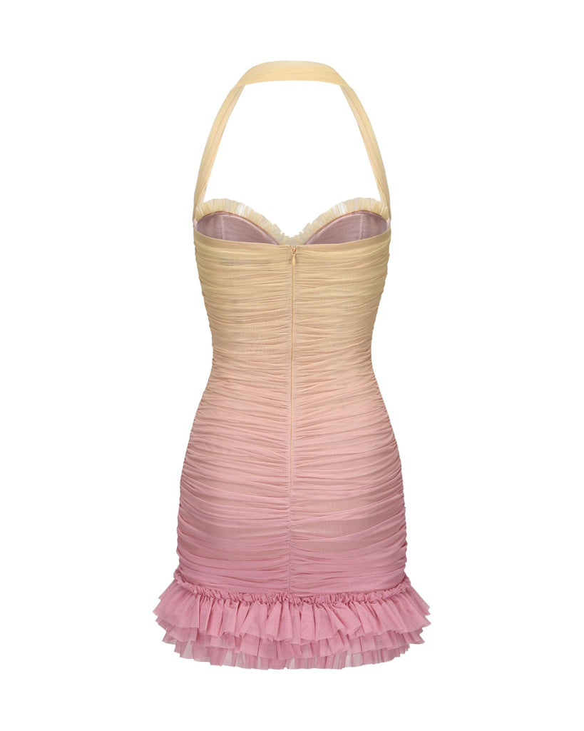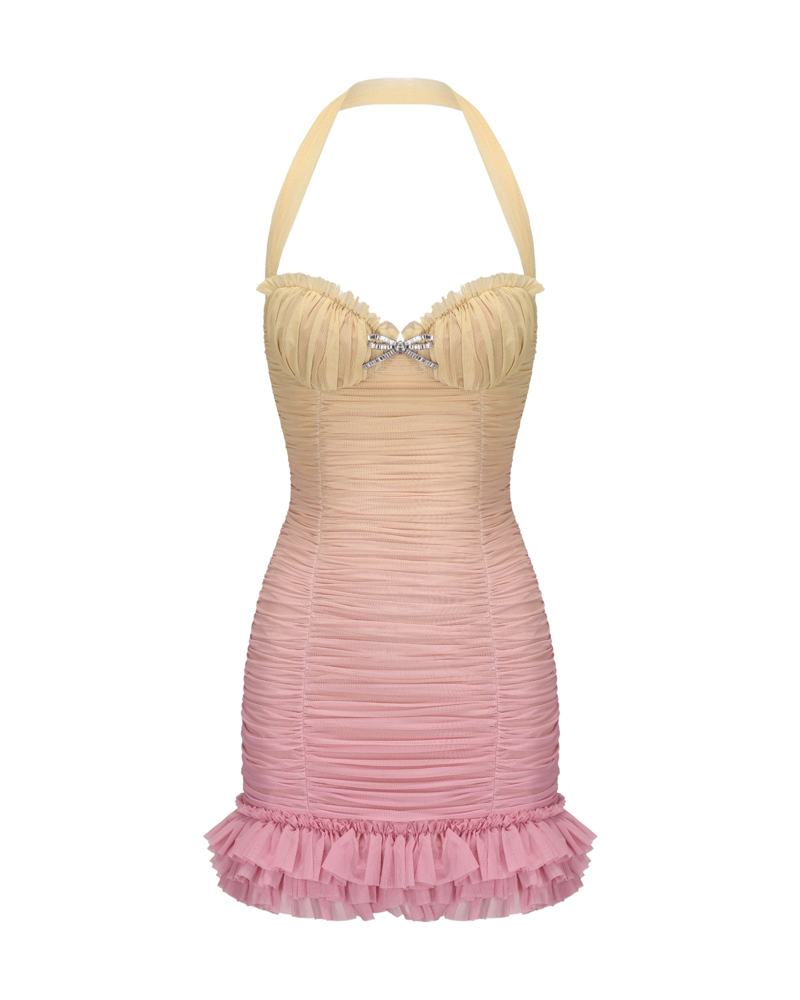 Expertly crafted with a gradient yellow color and a pleated hemline, the Joyce mini dress is a stylish and modern addition to any wardrobe. The intricate pleats create a unique and flattering silhouette, making this dress perfect for any occasion. Elevate your fashion game with the Joyce mini dress.