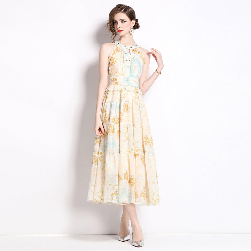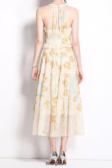 The Elvira Print Sleeveless Halterneck Midi Dress in Yellow is the perfect option for adding a pop of color to your wardrobe. With its vibrant yellow hue and stunning print design, this dress is sure to turn heads. The sleeveless halterneck style provides a flattering silhouette, making it suitable for any occasion. Elevate your style with this must-have dress.
