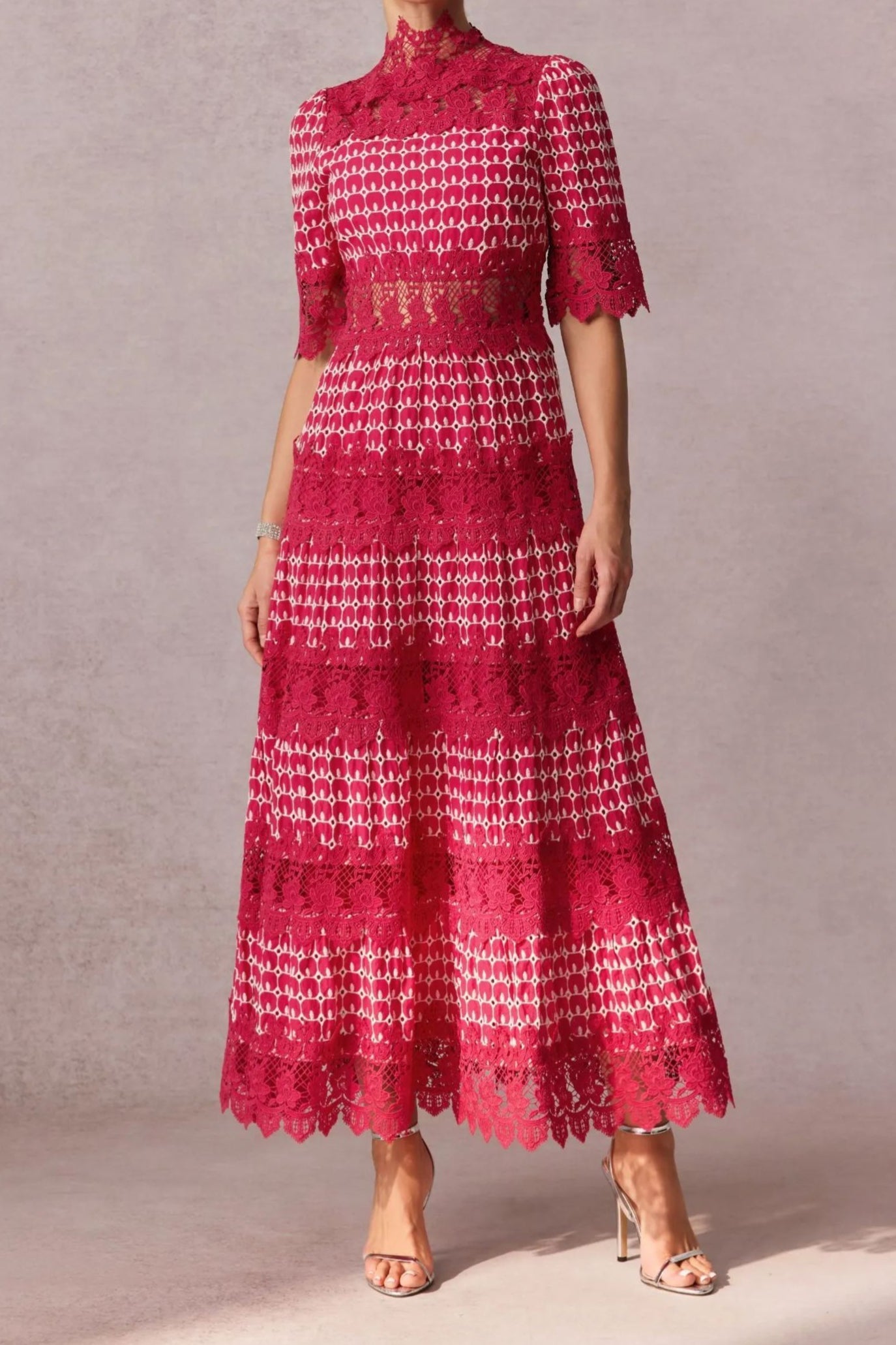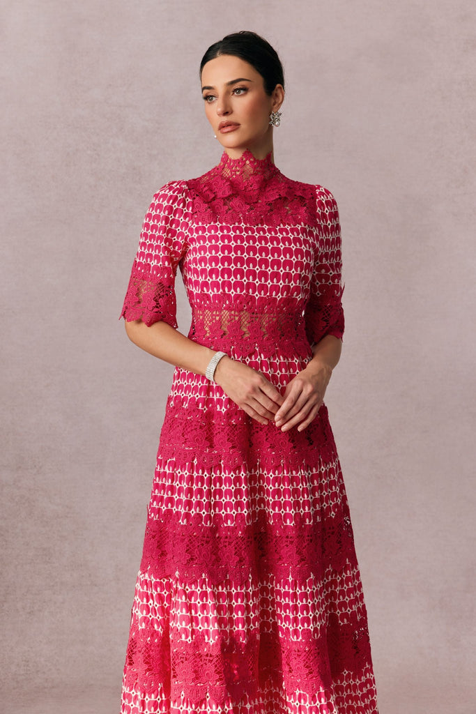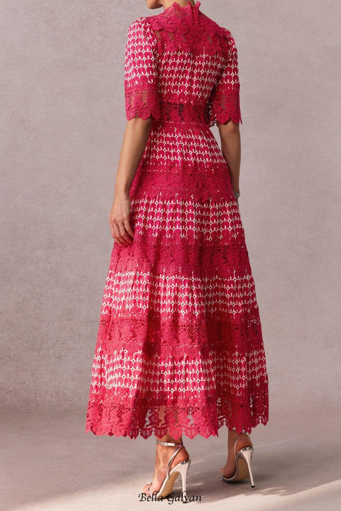 Mock Neck, Short Sleeves, Scallop Pattern Embroidered Lace, Lace Panelling, Midi Length.