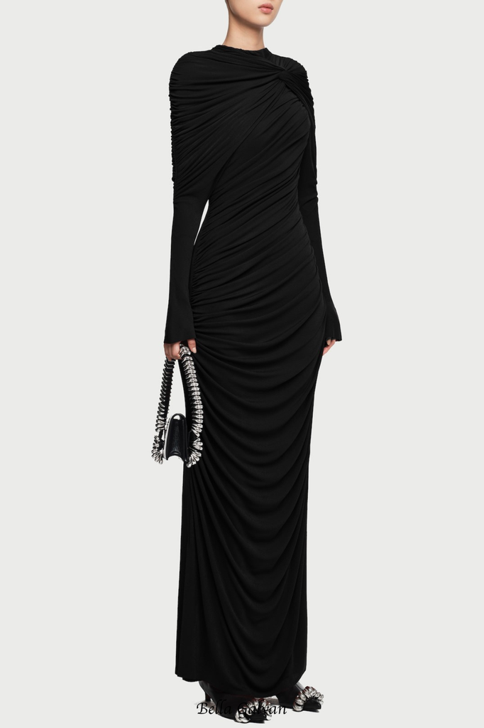 The Bonnie Long Sleeve Pleated Knot Bodycon Maxi Dress in black offers a refined silhouette with its expertly tailored pleats and knot detailing at the waist, enhancing your natural shape. Crafted to highlight elegance and comfort, this maxi dress features long sleeves and a bodycon fit for a polished, sleek look suitable for formal events or sophisticated evenings. The classic black color ensures versatility and timeless style in your wardrobe.