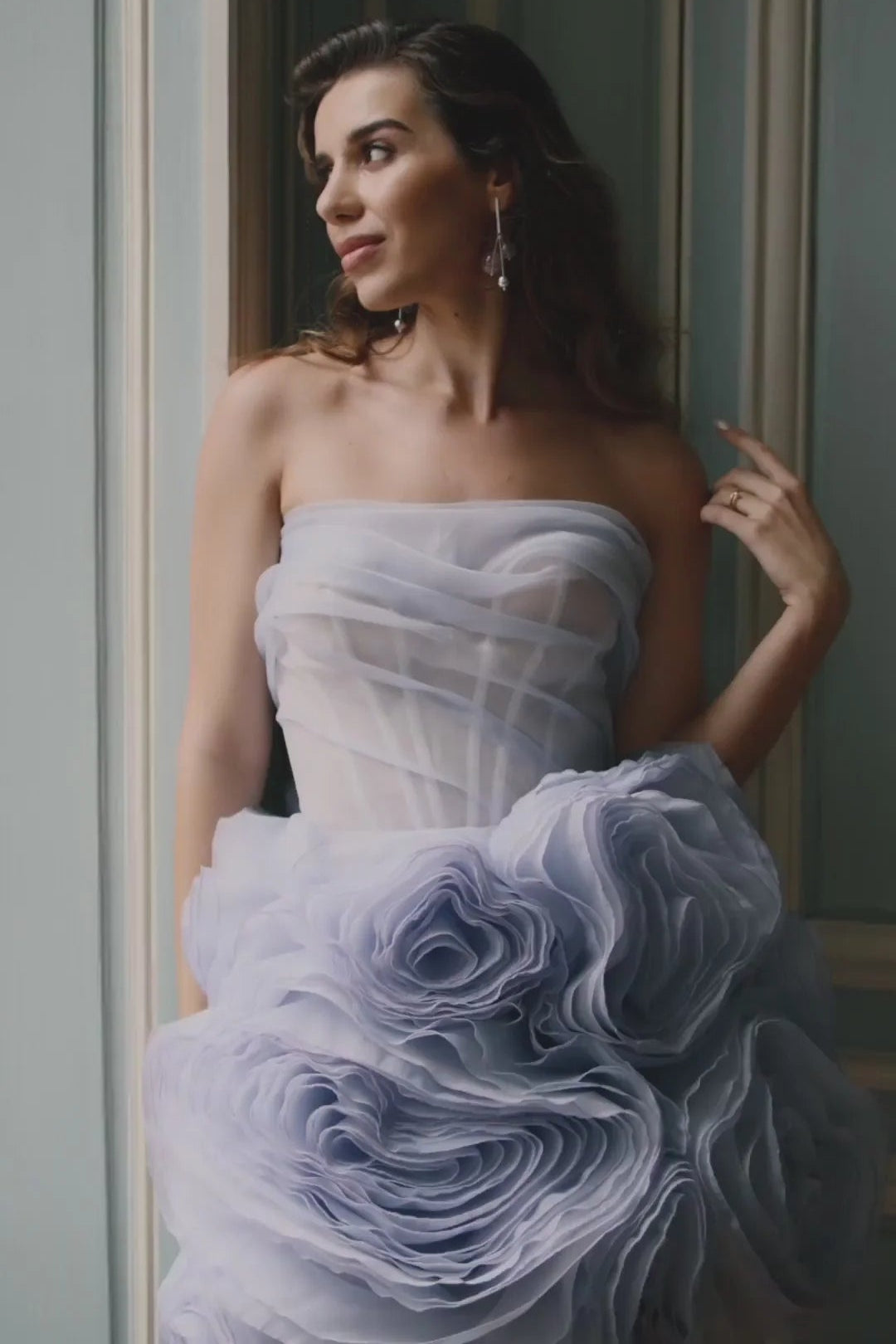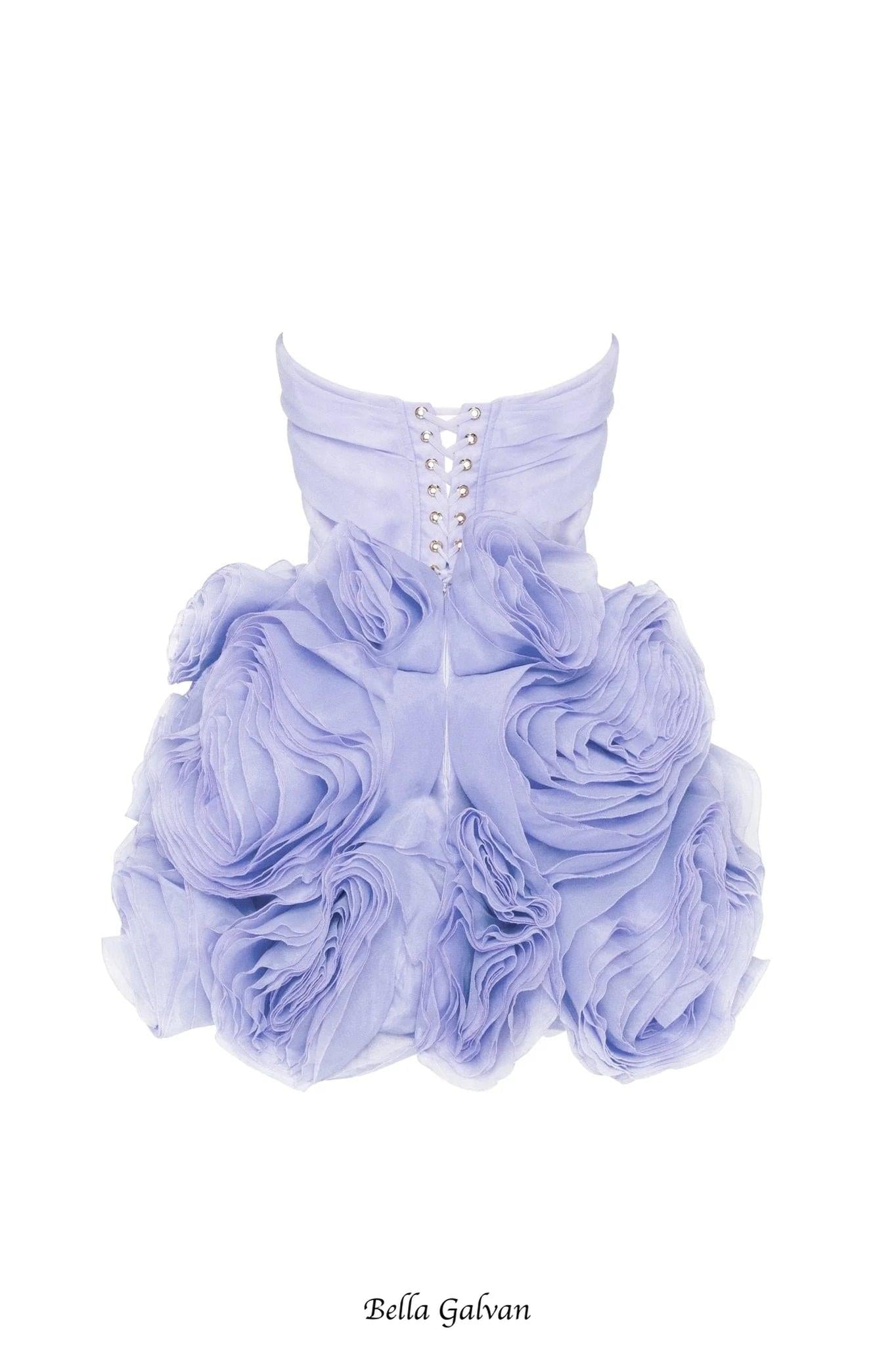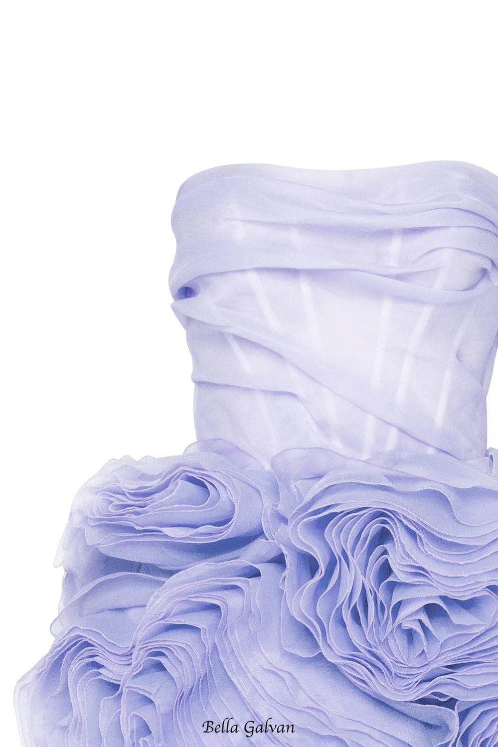 This Georgia appliquéd organza mini dress in delicate lavender exudes refined elegance through its sheer, textured fabric and intricate appliqué details. The lightweight organza offers a graceful silhouette, while the soft lavender hue enhances a sophisticated, feminine appeal. Perfect for special occasions, this dress combines craftsmanship and delicate design to make a memorable statement.