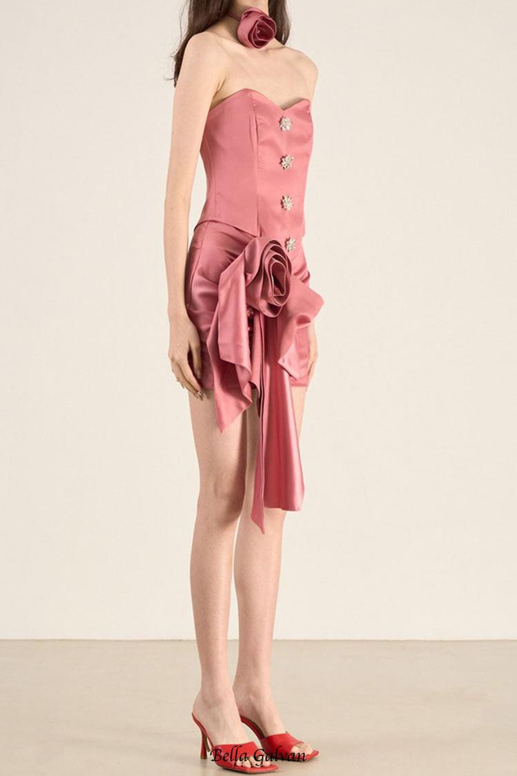 Tube Top Rosette Mini Two Piece Dress in Pink